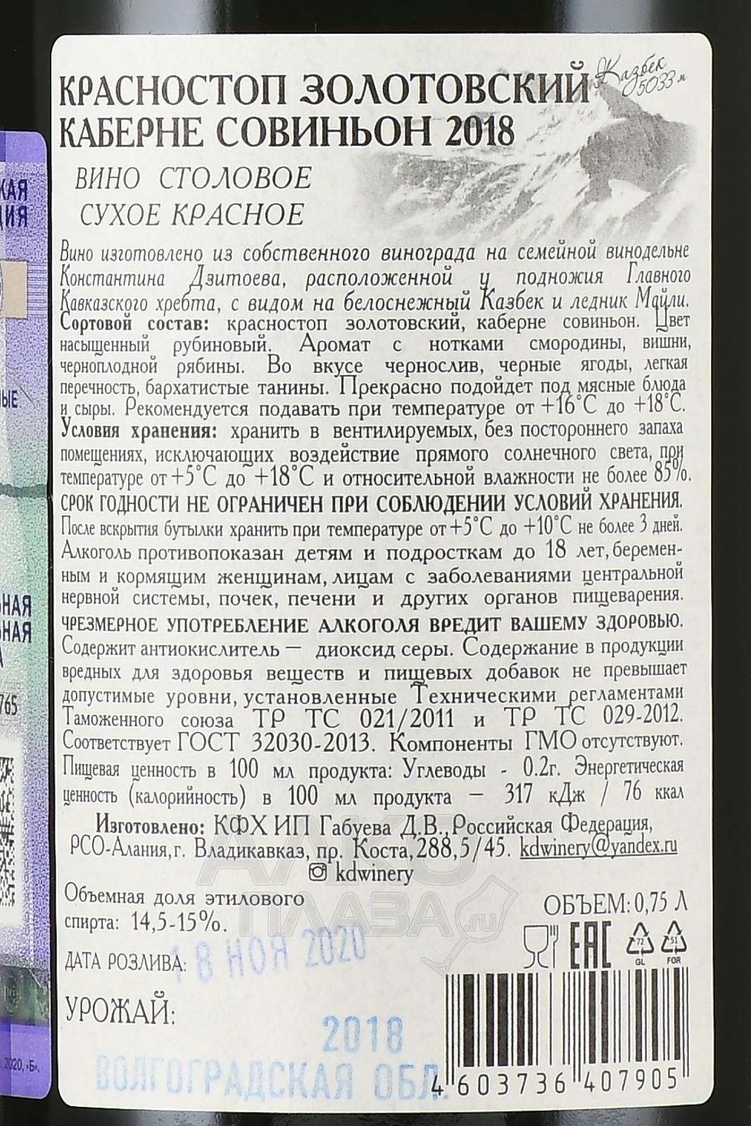 Красное сухое вино Красностоп Золотовский Каберне Совиньон Гранд Резерв КД 2018 г. 0,75 л представляет собой авторский купаж из международного и автохтонного российского сортов. Сырье было выращено на винограднике в окрестностях Геленджика (15-летние лозы) и доставлено в охлажденном виде на винодельню Константина Дзитоева, которая находится рядом с городом Владикавказом. Самые спелые ягоды прессовали, затем сусло выдерживали на кожице 3 дня при температуре 10 градусов. Ферментация протекала с мезгой при контролируемой температуре. Вино созревало в барриках из французского дуба не меньше года, далее выдерживалось 12 месяцев в бутылках.