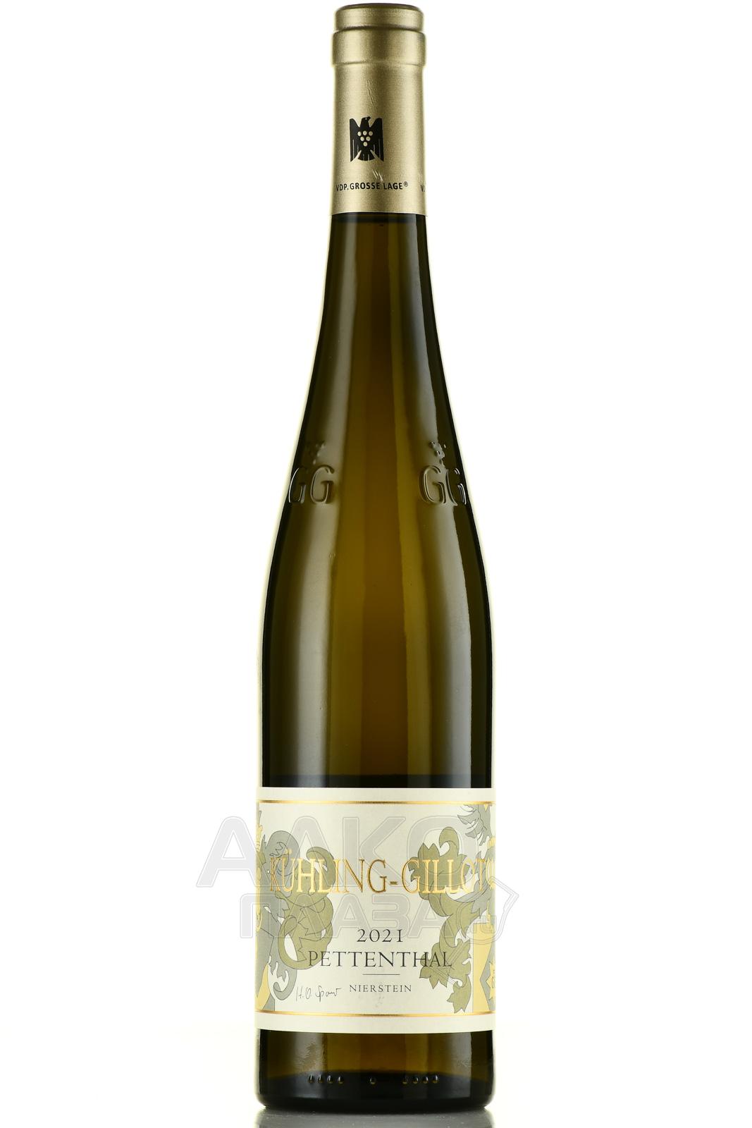 Белое сухое вино Kuhling-Gillot Nierstein Pettenthal Riesling Rheinhessen 2021 года 0,75 л — одно из лучших в линейке хозяйства Кюллинг-Гиллот из немецкого региона Рейнхессен. Оно имеет категорию GG, которая соответствует Гран Крю. Используемый для производства сорт Рислинг культивируется на отдельном винограднике Петентхаль — это очень крутой участок с уклоном почти 70 градусов и каменистой почвой. Тонкий верхний слой — гумусовый. Уход за старыми лозами (минимум 30-40 лет) осуществляется в рамках органических и биодинамических агротехник. Большая часть работ выполняется вручную. Для создания премиального вина использовался максимально спелый виноград категории ауслезе ручного сбора. Ферментация протекала в стали при низкой температуре, выдержка — в стальных резервуарах и дубовых фудрах по 3000 л. Вариация из урожая 2021 года будет храниться в бутылке не менее 10 лет.