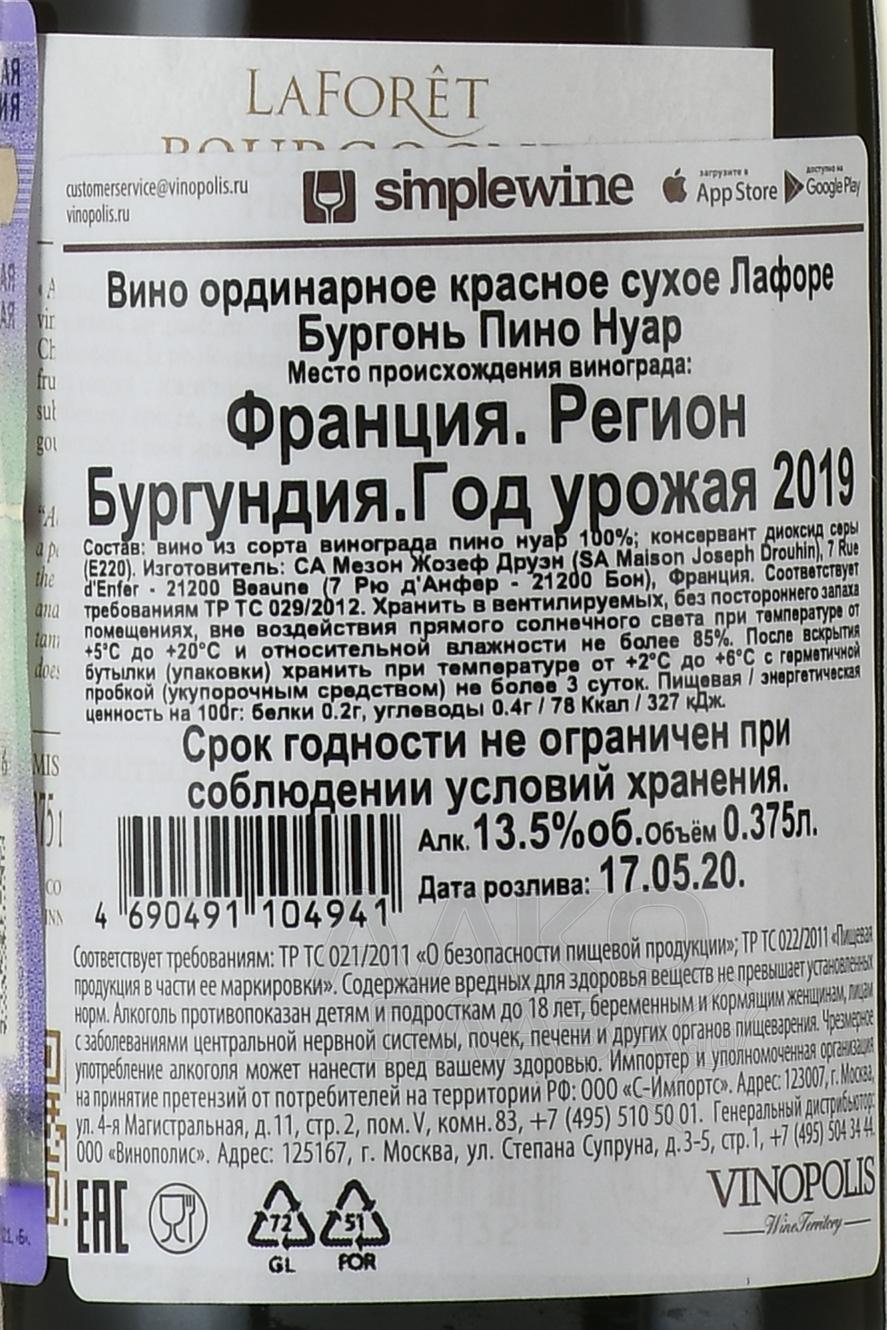Красное сухое вино Laforet Bourgogne Pinot Noir AOC 2019 г. 0,375 л – классический Пино Нуар из Старого Света, представленный в миниатюрном формате. Такой вариант можно выбрать для знакомства с брендом или в подарок для коллекционера. Сырье для производства собирают с нескольких участков, принадлежащих хозяйству Maison Joseh Drouhin. Лозы растут на глинисто-известняковых почвах, плотность - 10 тыс. растений на га, при этом урожайность искусственно снижена до 62 гектолитров с гектара. Сначала сусло мацерируют с мезгой 3 недели, далее осуществляется контролируемая ферментация. Производится яблочно-молочное брожение. Вино выдерживается 8 месяцев в стальных емкостях, затем в б/у бочках из французского дуба. Потенциал дальнейшего хранения в бутылке составляет 5 лет.