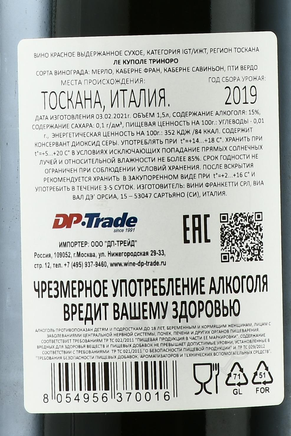 Красное сухое вино Le Cupole Trinoro 2019 года 1,5 л — роскошное, богатое, с потенциалом минимум 10 лет. Это один из лучших образцов, созданных руками винодела Андреа Франкетти, а также эталонный представитель красной Тосканы в своем ценовом сегменте. Четыре традиционных сорта, вошедшие в купаж, были выращены на высоте 450-600 м. Лозы старше 25 лет. Виноградник обрабатывается в рамках органических методик. Сбор сырья — ручной. Ферментация протекала в стальных резервуарах, 3-летняя выдержка — частично в дубовых барриках, частично — в бетонных емкостях.