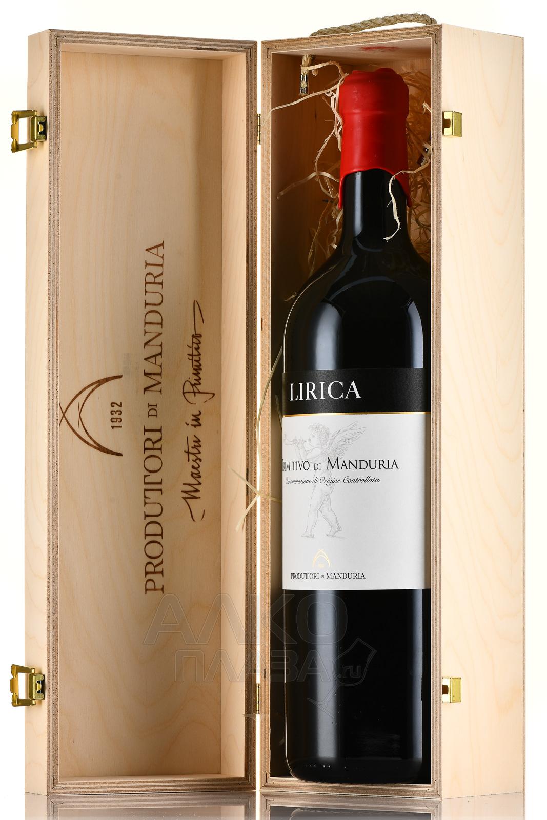 Красное сухое вино Lirica Primitivo di Manduria DOC 2017 г. 3 л в д/у — подарочный вариант в стильном деревянном ящичке — такой презент подойдет для особого повода. Алкоголь элитного класса производится из сорта Примитиво, который выращивается в итальянском регионе Апулия. Для винтажа 2017 года использовался урожай с 15-25-летних лоз. Сбор винограда начался в первых числах сентября и закончился через 2 недели. Ферментация и мацерация протекали в стальных емкостях при контролируемой температуре. Выдержка вина в бочках из славонского дуба длилась около полугода.