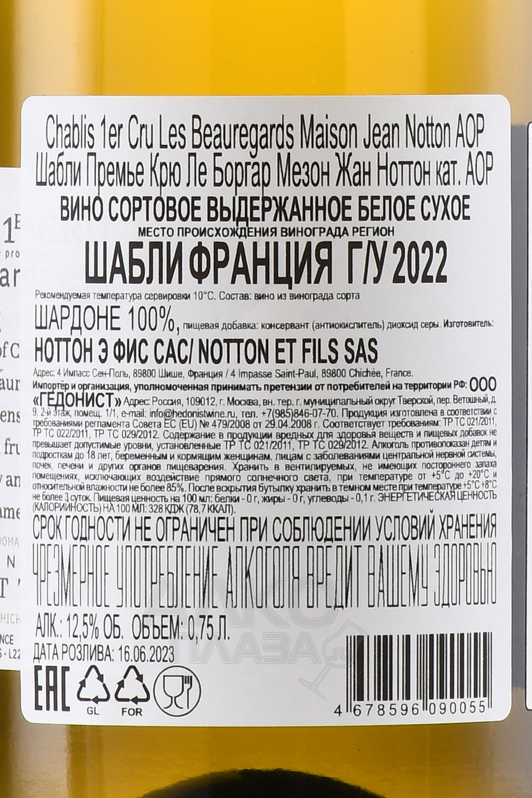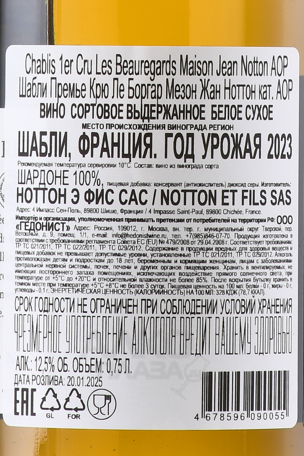 Maison Jean Notton Chablis 1er Cru Les Beauregards - вино Мезон Жан Ноттон Премье Крю Шабли Ле Боргар 0.75 л белое сухое