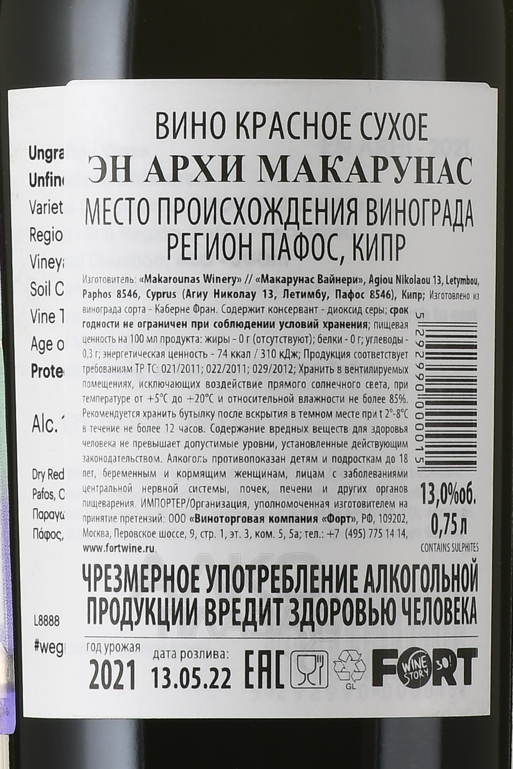 Красное сухое вино Makarounas En Arhi 2012 г. 0,75 л изготовлено на Кипре из винограда европейского сорта, собранного в определенный сезон на высоте до 450 м над уровнем моря по достижении ягодами оптимальной зрелости. Виноград с органических территорий близ города Пафос, где господствует теплый климат со средиземноморскими проявлениями, подвергся мацерации на кожице сроком 14 суток и спонтанному сбраживанию в стальных баках. Розлив осуществился без применения фильтрации и оклейки.