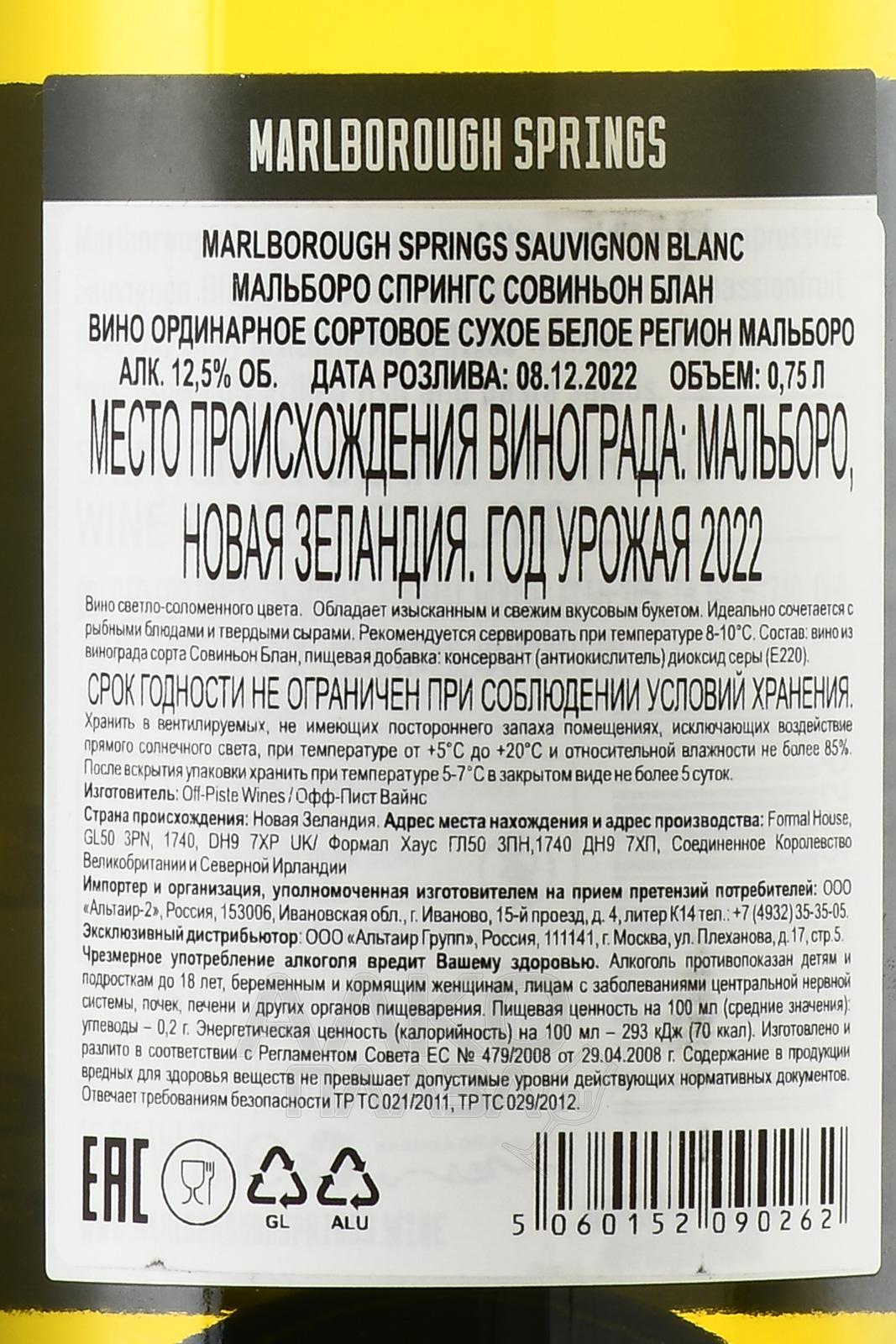 Белое сухое вино Marlborough Springs Sauvignon Blanc 2022 г. 0, 75 л обладает легким изящным характером и наглядно демонстрирует великий потенциал новозеландского региона Мальборо. Оно создано из сорта Совиньон Блан, который собирают на пике спелости и тщательно сортируют. Ферментация осуществляется в рамках классической технологии при постоянном контроле температурного режима. Вино недолго выдерживается в стальных резервуарах и остается молодым. Оно идеально подходит для легкой трапезы, летних пикников и вечеринок. Рекомендуется не хранить его в бутылке более 2-3 лет.