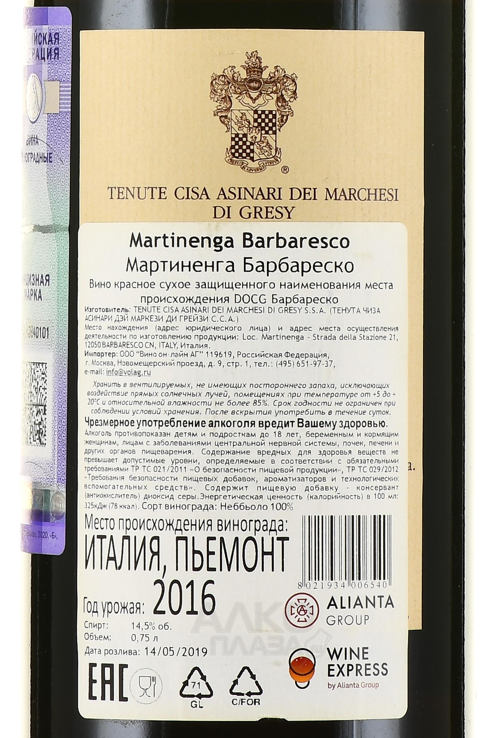 Красное сухое вино Martinenga Barbaresco 0,75 л - великолепный напиток,, способный наиболее полно раскрыть уникальный терруар Барбареско. Для изготовления используются отборные ягоды, собранные ручным способом с участков, высота которых колеблется от 220 до 290 метров над уровнем моря. Полученный урожай прессуется, далее производится мацерация и ферментация при соблюдении температурного режима с последующим яблочно-молочным брожением. Готовое вино созревает на протяжении 12 месяцев в барриках, часть из которых новые, затем еще 1 год в болгарских дубовых бочках, далее производится розлив и дозревание в погребах винодельни в течение года.