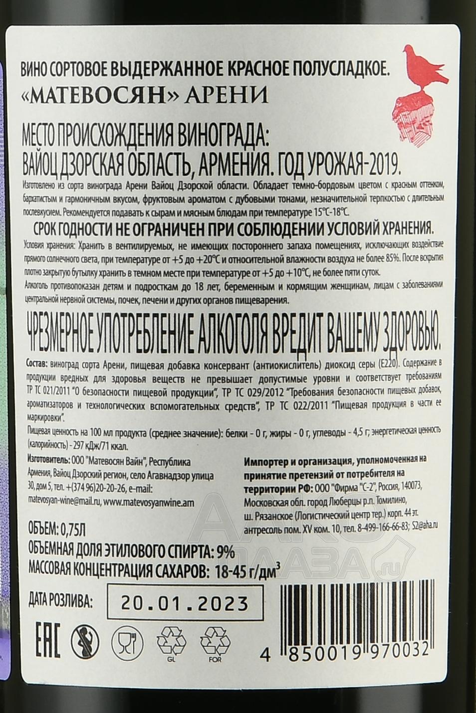 Matevosyan Areni - вино Матевосян Арени 0.75 л красное полусладкое