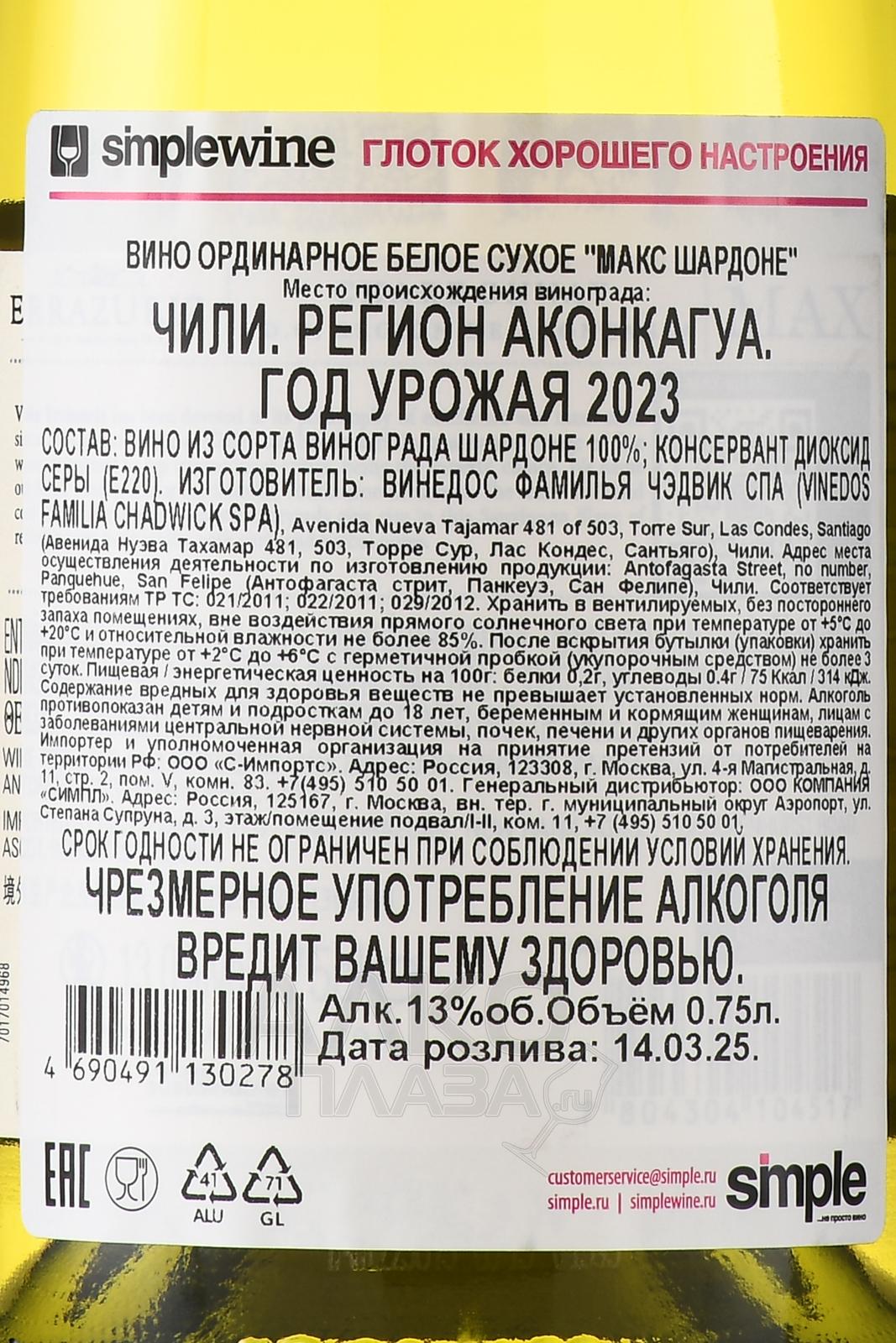 Белое сухое вино Errazuriz Max Chardonnay 0,75 л является моносортовым образцом, производимым из ягод, собранных с участков в регионе Касаблака. Урожай собирают вручную на пике спелости с участков, высаженных в 1997 году. Грозди созревают равномерно из-за влияния Тихого океана и теплого климата. После сортировки и деликатного прессования происходит алкогольная ферментация при строгом температурном контроле. Для половины готового вина проводилась малолактическая ферментация, а другая половина созревала на дрожжевом осадке.