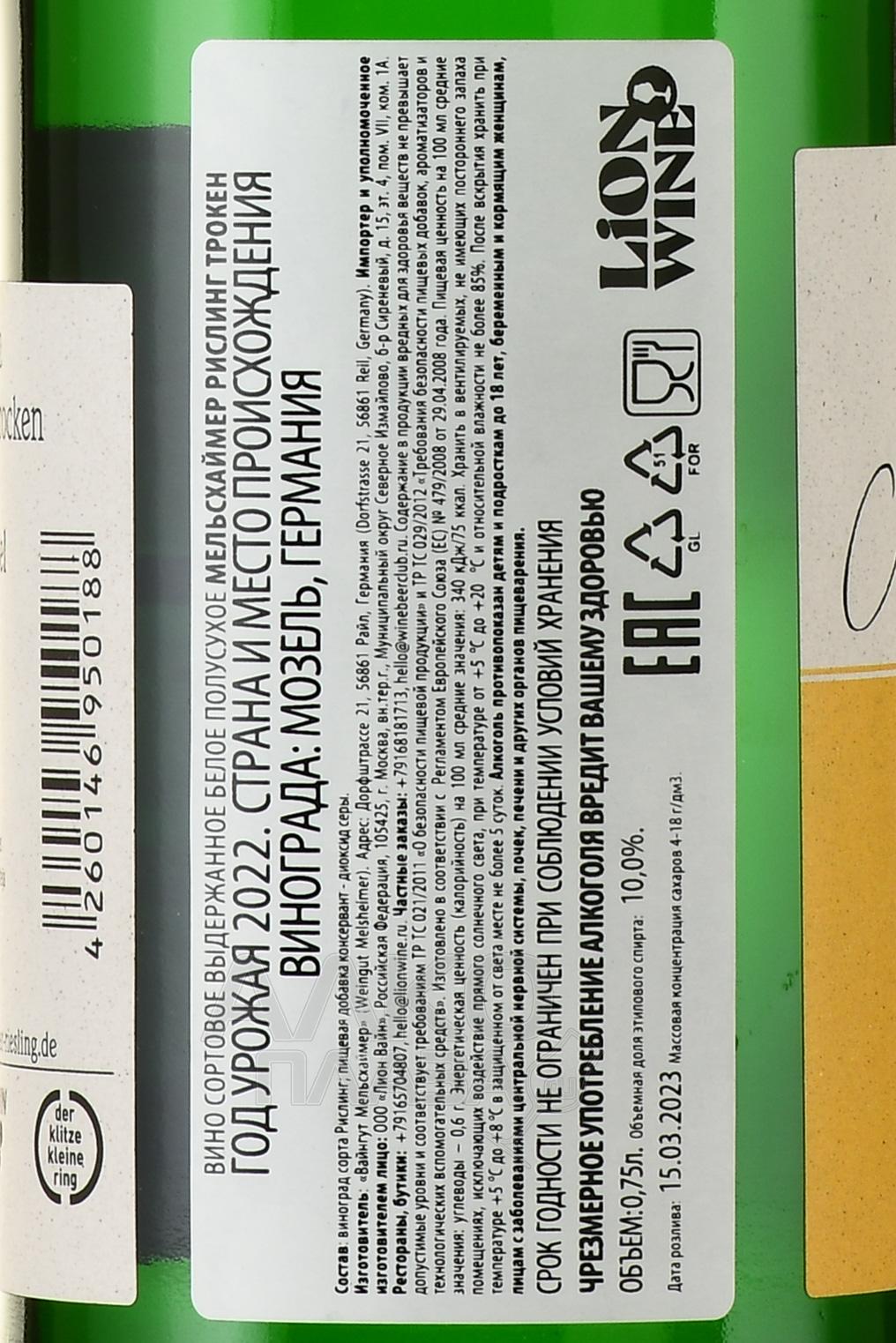 Белое полусухое вино Melsheimer Riesling Trocken 0,75 л – изысканный образец от биодинамической компании из Мозеля. Напиток создан из плодов одного периода сбора, созревших на виноградниках с сертификатами Demeter и ECOVIN. Ферментация проходила в течение нескольких месяцев в огромных 1000-литровых бочках-фудрах. В производстве не использовался животный белок.