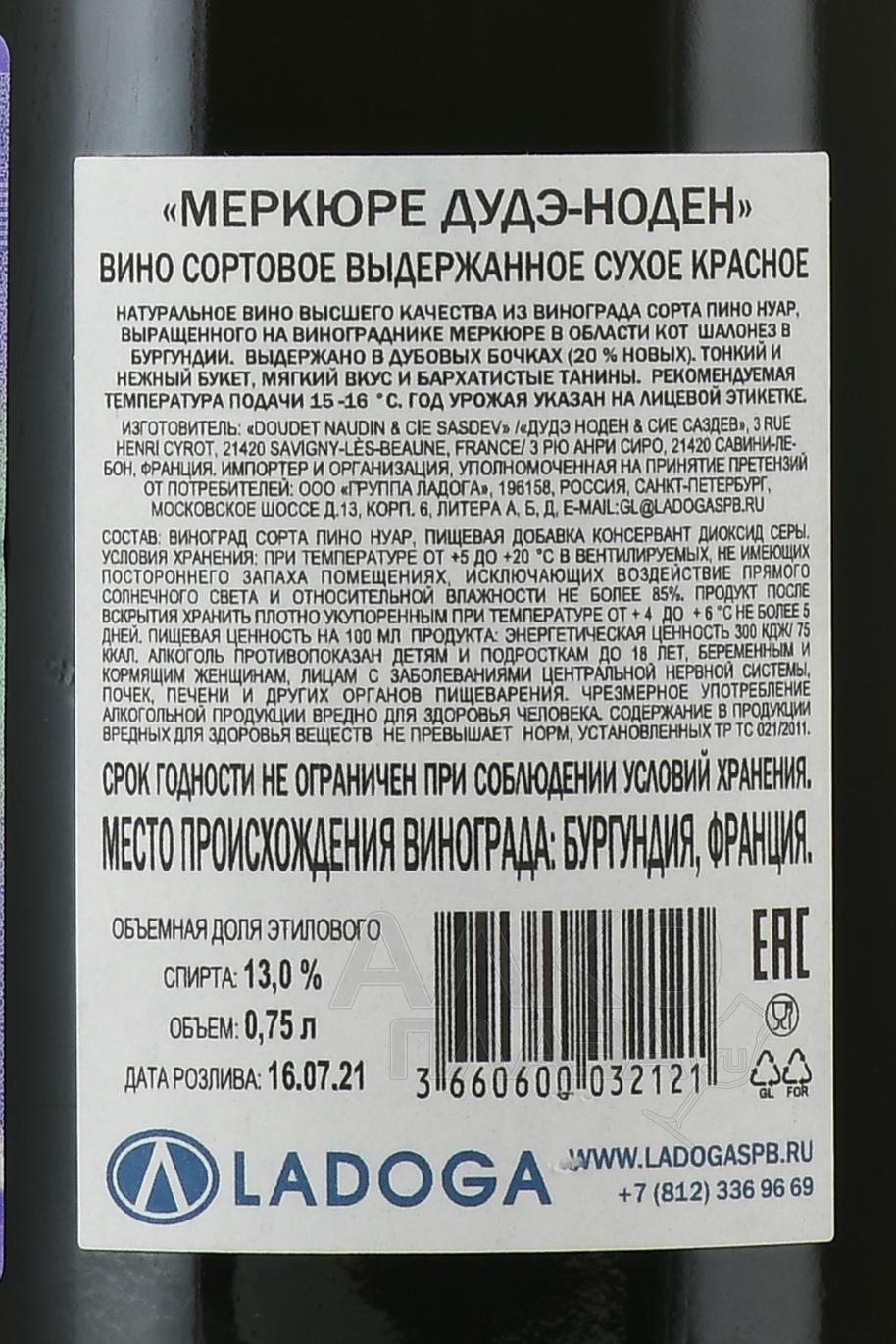 Красное сухое вино Mercurey Doudet Naudin 0.75 л — премиальный моносортовой напиток Бургундии, созданный из сорта Пино Нуар одного года сбора, который был выращен в Кот-Шалонез, в деревне Меркюре, где производятся больше половины красных вин региона. Ферментируется вино в чанах из стали больше месяца, по окончании ферментации оно выдерживается в бочках из дуба — 20 процентов их которых новые — чуть больше года.