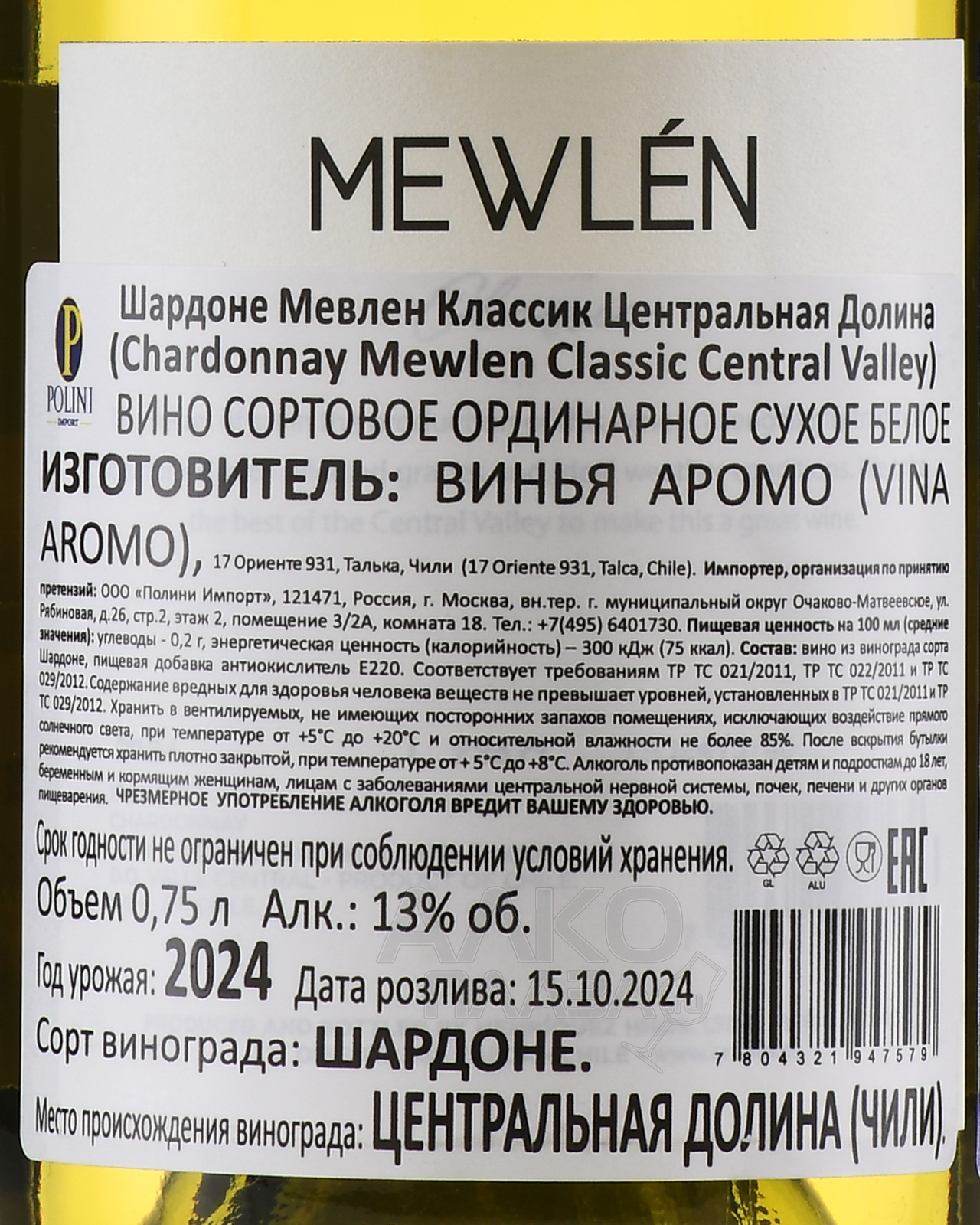 Белое сухое вино Mewlen Classic Шардоне 2023 года 0,75 л, создано из винограда одного сорта, выращенного на виноградниках с особым микроклиматом в регионе Мендоса в Аргентине. Применяется бережный ручной сбор ягод на рассвете, когда температура наиболее низкая, что помогает сохранить свежесть и фруктовые оттенки. После деликатного прессования сусло медленно ферментируется в резервуарах из нержавеющей стали при строго контролируемой температуре. Вино выдерживается в течение нескольких месяцев на осадке, периодически подвергаясь процедуре батонажа для получения насыщенной текстуры и сбалансированного вкуса. Уникальность этого аргентинского Шардоне заключается в сочетании свежести, выразительного фруктового характера и элегантной структуры, достигаемой благодаря тщательному контролю на каждом этапе производства.