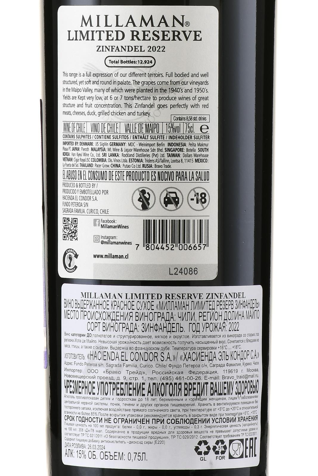 Красное сухое вино Millaman Limited Reserve Zimfandel 2018 год 0,75 л относится к классу выдержанного алкоголя, так как долго вызревало в бочке из французского дуба — двенадцать месяцев. До проведения этой стадии напиток винифицировался стандартным способом. Обработке подвергся виноград со старых лоз чилийской Долины Майпо, многие из которых были посажены в 40-х и 50-х годах XX века. Урожайность ограничена 6-7 тоннами на один гектар для формирования структурированной и концентрированной органолептики. Напиток выпустили лимитированной серией из 12924 штук.