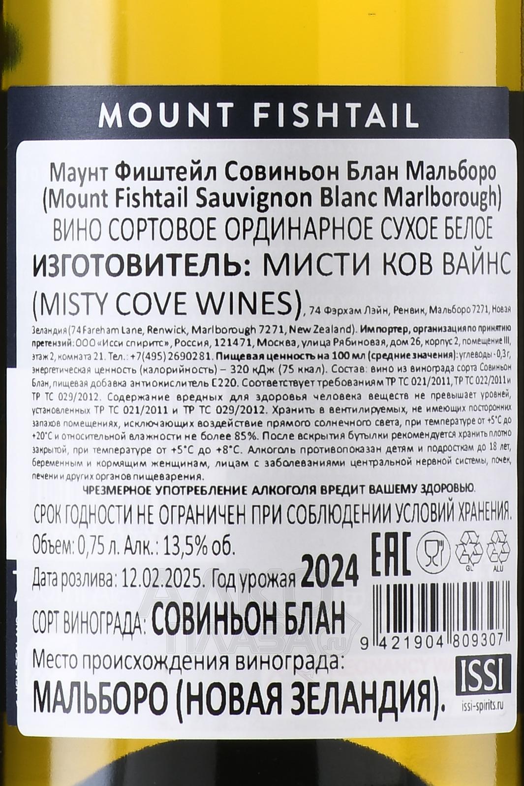 Белое сухое вино Mount Fishtail Sauvignon Blanc Marlborough 2022 г. 0,75 л – классический новозеландский образец из ягод флагманского сорта островов. На винификацию пошли плоды, собранные прохладным утром с лоз, которые произрастают в регионе Мальборо. На заводе сырье медленно прессовали, а полученный сок так же медленно ферментировали в резервуарах из нержавеющей стали при низких температурах.