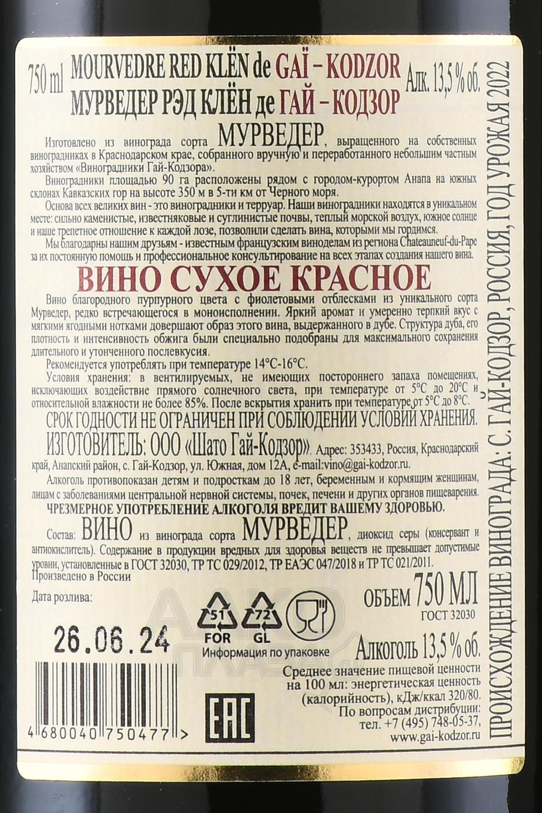 Красное сухое вино Mourvedre Red Klen de Gai-Kodzor 0,75 л — плотное, насыщенное, структурное, ароматное, почти непрозрачное. Входит в коллекцию выдержанных сортов хозяйства Гай Кодзор, названную в честь красных канадских кленов, которые растут прямо над винным погребом. Эти вина олицетворяют собой уникальный стиль производителя и выпускаются ограниченными тиражами. Редкая моносортовая разновидность из Мурведра создавалась из сырья с собственных виноградников, расположенных в 5 км от Черного моря, рядом с городом-курортом Анапой, на склонах Южного Кавказа. Лозы (средний возраст — 16 лет) здесь растут на высоте 350 м на каменисто-известняковых и суглинистых почвах в зоне теплого приморского климата. Винификация осуществлялась по традиционной технологии. Вино было выдержано 14 месяцев в бочках из французского дуба (слабый обжиг) и стальных резервуарах, затем купаж 4 месяца отдыхал перед розливом в стали.