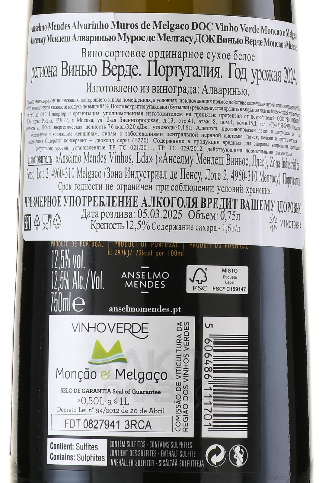 Белое сухое вино Muros de Melgaco Alvarinho Vinho Verde DOC 0,75 л изготавливается из винограда, который растет на участках с южной экспозицией в субзоне Мельгасу. Урожай собирается вручную в ящики по 20 кг. На винодельне проводится прессование без гребнеотделения. Алкогольная ферментация и выдержка на осадке на протяжение полугода с регулярным батонажем осуществляются во французских дубовых бочках.