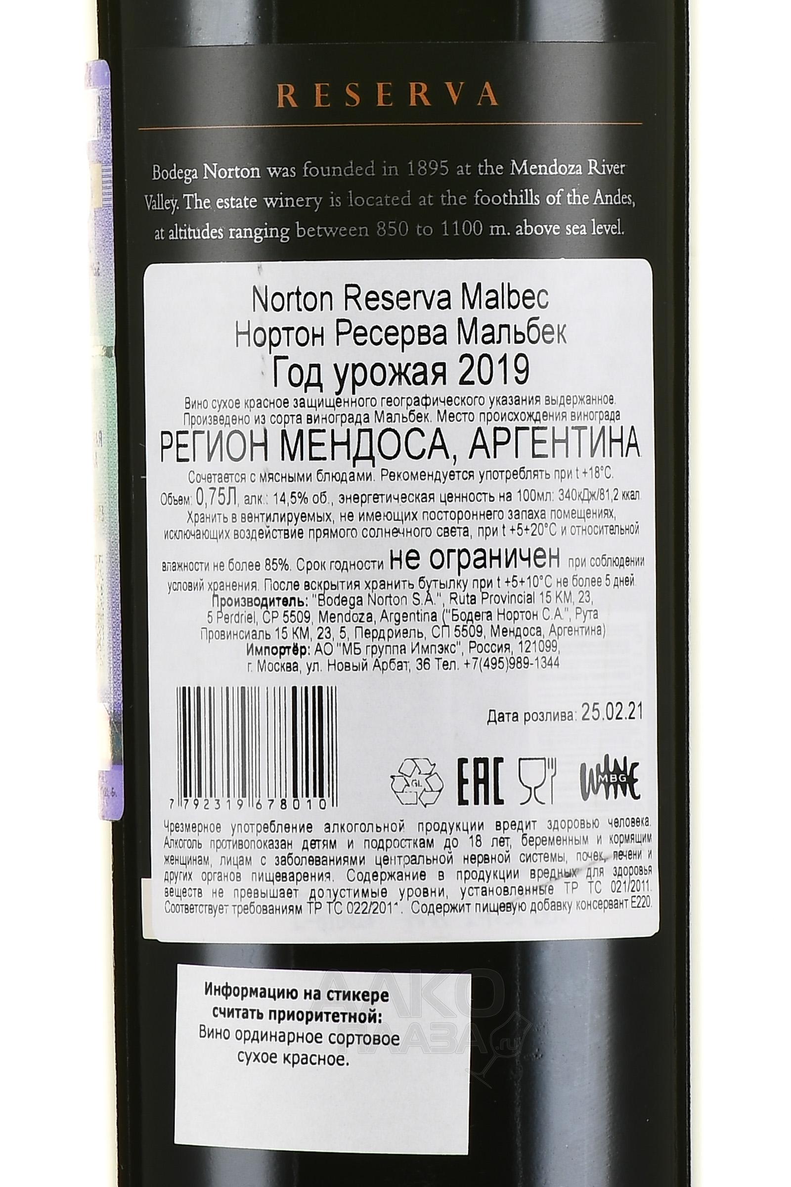 Красное сухое вино Norton Reserva Malbec из линейки выдержанных напитков аргентинского производителя было изготовлено в регионе Mendoza на основе одного сорта винограда с угодий Лухан-де-Куйо (высота расположения — 850-1100 м над уровнем моря). Ягоды сорвали с 80-летних лоз и подвергли пятидневной холодной мацерации, а затем поместили в нейтральные емкости для мацерации и ферментации при контролируемой температуре 25 °C. Также вино прошло яблочно-молочное брожение и вызревание в дубе сроком 12 месяцев. Дополнительная выдержка в бутылках заняла 10 месяцев. Вариация крепостью 14,5 градуса обладает неплохим потенциалом к хранению — около 8 лет.