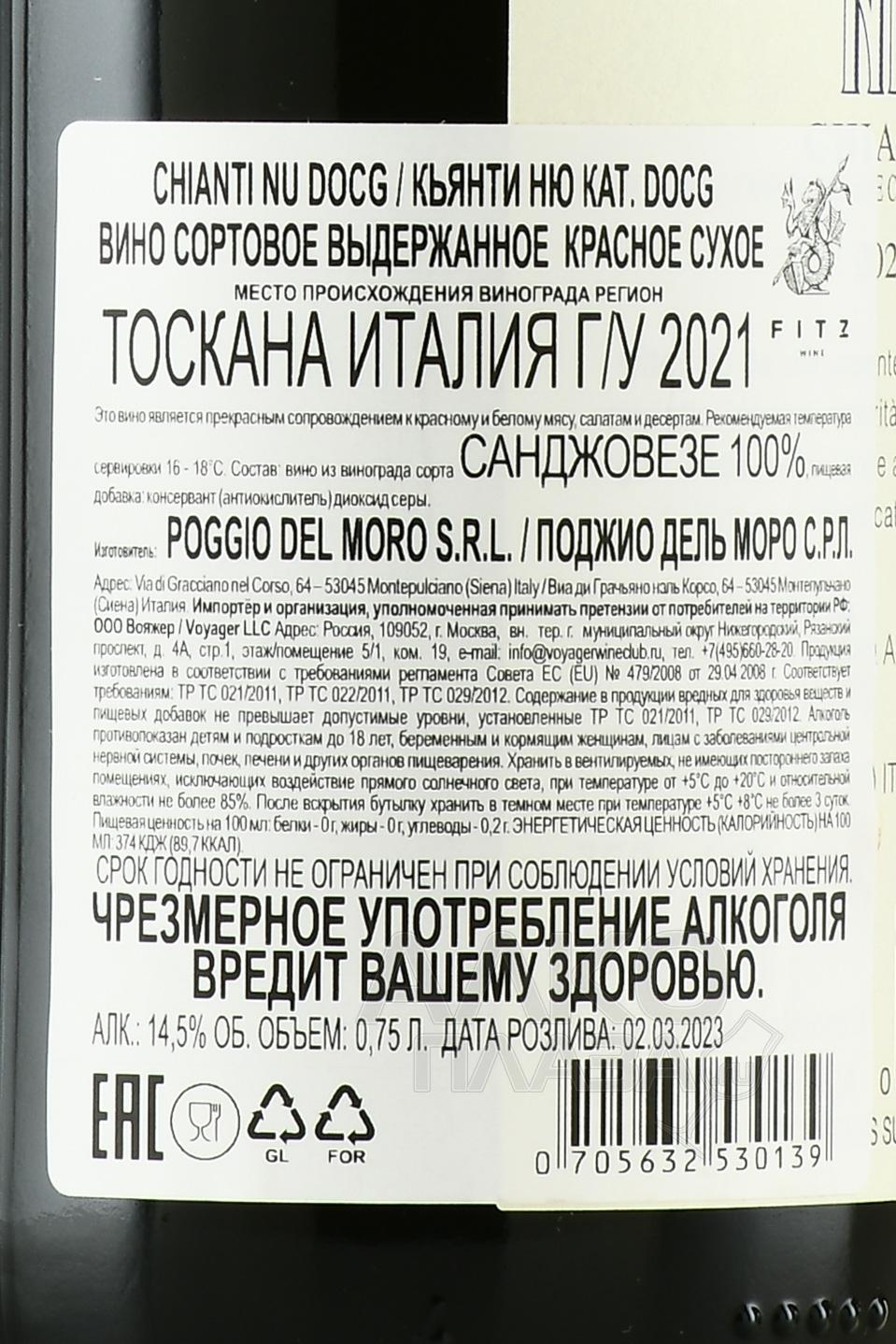 Красное сухое вино Nu Chianti DOCG 2021 года 0,75 л — великолепное молодое Кьянти без прикрас, какое оно есть в своей исключительной натуральности, естественности. Название Ню — это сокращение от слова nude («голый, обнаженный, ничем не прикрытый», также употребляется в значении «натуральный»). Для производства использовался сорт Санджовезе с виноградников дель Меццоджорно и делла Маттина, расположенных в престижной зоне Кьянти Колли Сенези. Лозы (10-20-летние) растут на высоте примерно 350 м на юго-западных и юго-восточных склонах холмов, на глинисто-песчано-суглинистых почвах. Сбор урожая ручной (в ящики по 10 кг). Винификация начинается с 7-дневной мацерации при температуре не более 28 градусов с регулярной перекачкой. Далее сусло отжимают, часть (30%) посещают в старые дубовые бочки по 5 гектолитров, остальное (70%) - в стальные резервуары. Брожение длится 3 месяца, затем составляется купаж, который выдерживается полгода в стали. Бутилирование проводилось в самом начале марта 2023 года в новолуние, далее вино отдыхало несколько месяцев в подвалах винодельни.