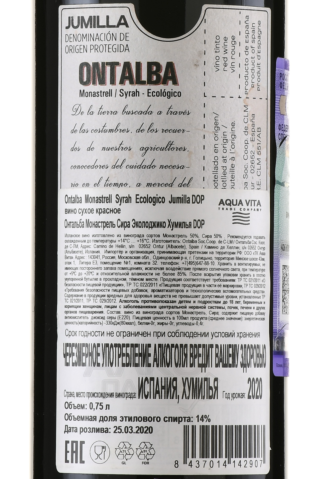 Ontalba Ecologico Monastrell Syrah Jumilla - вино Онтальба Эколоджико Монастрель Сира Хумилья 0.75 л красное сухое