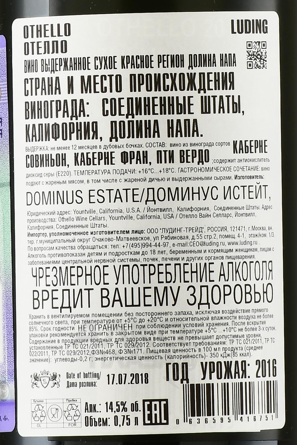 Красное сухое вино Othello Napa Valley 2016 г. 0,75 л — бленд трех виноградных вариаций с угодий США, расхоложенных в границах штата Калифорния, Долине Напа. Спелые ягоды ручного сбора с почв, имеющих суглинисто-гравийный состав, прошли отжим и винификацию — раздельную для каждого сорта. Для достижения гармонии и глубины вкусоаромата вино налили во французские баррики на 1 год и 2 месяца. Бутилирование выполнили без предварительной фильтрации.