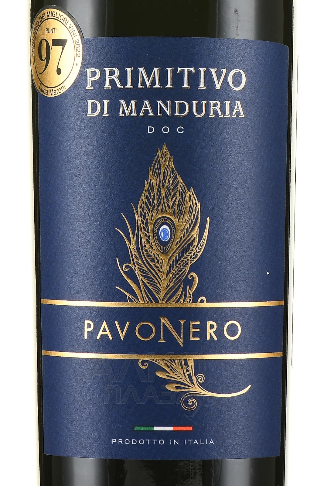 Красное полусухое вино Pavo Nero Primitivo di Manduria 2019 г. с уровнем содержания алкоголя 14,5% было произведено в итальянском регионе Апулия, области Примитиво ди Мандурия, из тщательно отобранного винограда одного сорта с угодий этой территории. Ягоды оптимальной зрелости прошли стадии мацерации и окисления при контролируемой температуре. Перед розливом вино подвергалось фильтрации.