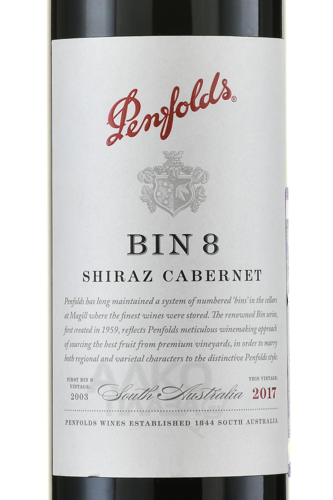 Красное сухое вино Penfolds Bin 8 Cabernet Shiraz 0,75 л — купаж из двух темных сортов, выращенных в Южной Австралии. Сырье получают из трех терруаров — долины Макларен, долины Баросса и Верхней Аделаиды. Ферментация осуществляется по классической технологии. Вино выдерживается во французских и американских бочках, из которых 10% новые. Потенциал хранения в бутылках составляет 5-10 лет.