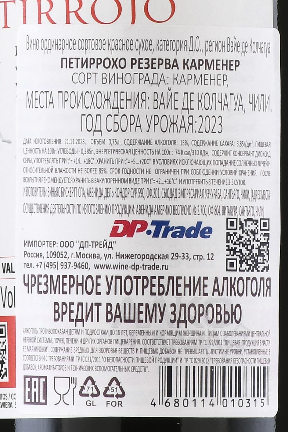 • Petirrojo Reserva Carmenere - вино Петиррохо Резерва Карменер 0.75 л красное сухое