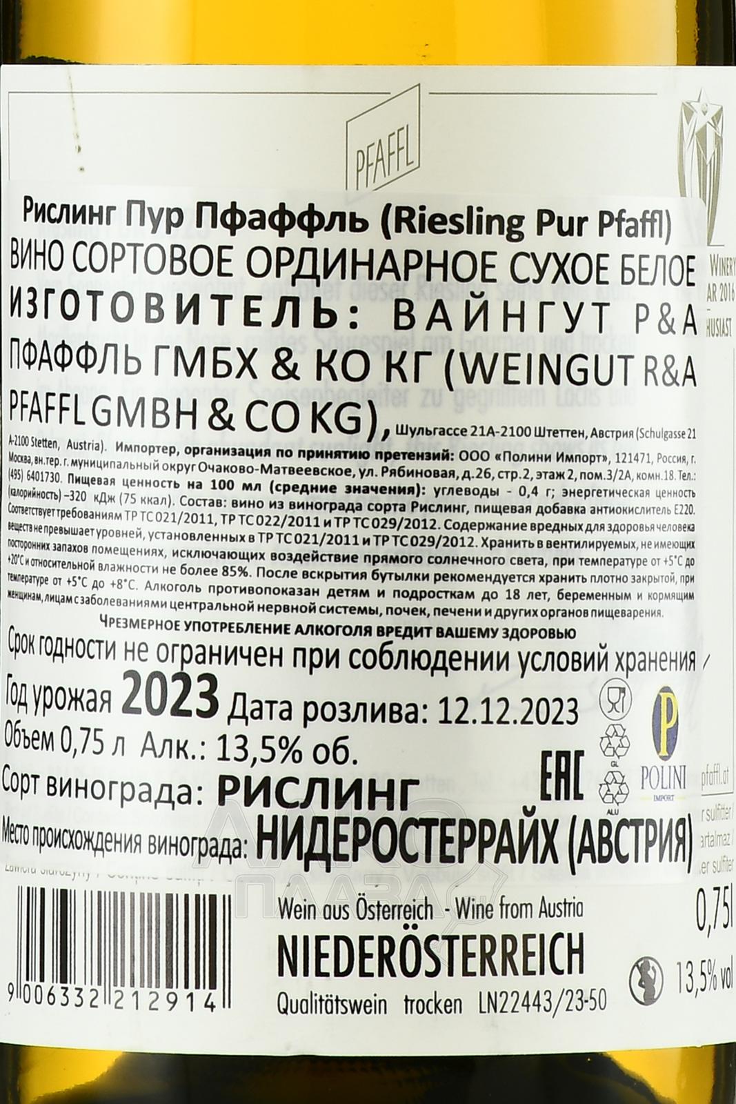 Белое сухое вино Pfaffl Pur Riesling 0,75 л — моносортовой алкоголь в классическом австрийском стиле, основой которого стал популярный среди местных виноделов сорт винограда — Рислинг. Его сорвали с лоз спелым по достижении необходимой сладости. На переработку поступил урожай ограниченного периода сбора, отделенный от веточек и косточек. Сырье подверглось мягкому отжиму и сбраживанию в металлических баках при 19 градусах Цельсия. После кратковременной выдержки вино разлили по бутылкам. Специалисты не советуют долго хранить бутылку, ведь напиток наилучшим образом раскрывает утонченную вкусоароматику в молодом виде.