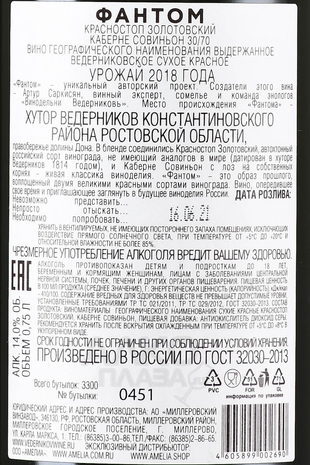 Красное сухое вино Phantom Krasnostop Zolotovskiy Cabernet Sauvignon 30/70 0,75 л — качественный алкоголь с яркими чертами терруара Ростовской области РФ, который состоит из двух сортов винограда, обозначенных в его названии. Это спиртное является флагманским напитком компании и создается только в лучшие урожайные годы. Изготовление выполнили по европейской методике терморегулируемого брожения с делестажем и вызревания в бочонках из цельной французской дубовой древесины, которое продлилось не менее восьми месяцев. Специалисты рекомендуют дать вину «подышать» перед дегустацией, кроме того, ему не повредит декантация.