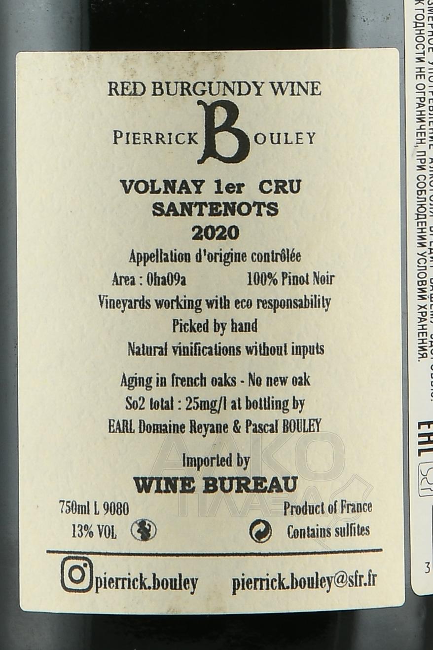 Красное сухое вино Пьеррик Були Сантено Премьер Крю Вольне АОС 2020 г. 0,75 л — суперпремиальный моносепажный напиток Бургундии, созданный при участии винограда Пино Нуар, выращенного органическим способом на 60-летних лозах класса Премьер Крю в Вольне и собранного в течение ограниченного периода. При брожении производитель использует только натуральные дрожжи. Выдерживают вино в барриках из древесины дуба на протяжении одного года. Бутилируют напиток после нежной фильтрации.