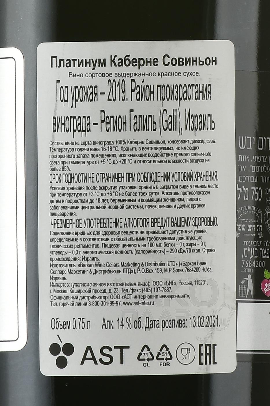 Красное сухое вино Platinum Cabernet Sauvignon 2019 г. 0,75 л — израильский качественный напиток с 14-процентной спиртуозностью, основой которого стал отборный виноград области Галилея. Его собрали в течение ограниченного сезона на высоте от 200 до 300 м над уровнем моря и подвергли классической винификации. Перед бутилированием вино полтора года выдерживалось в дубовых бочонках.