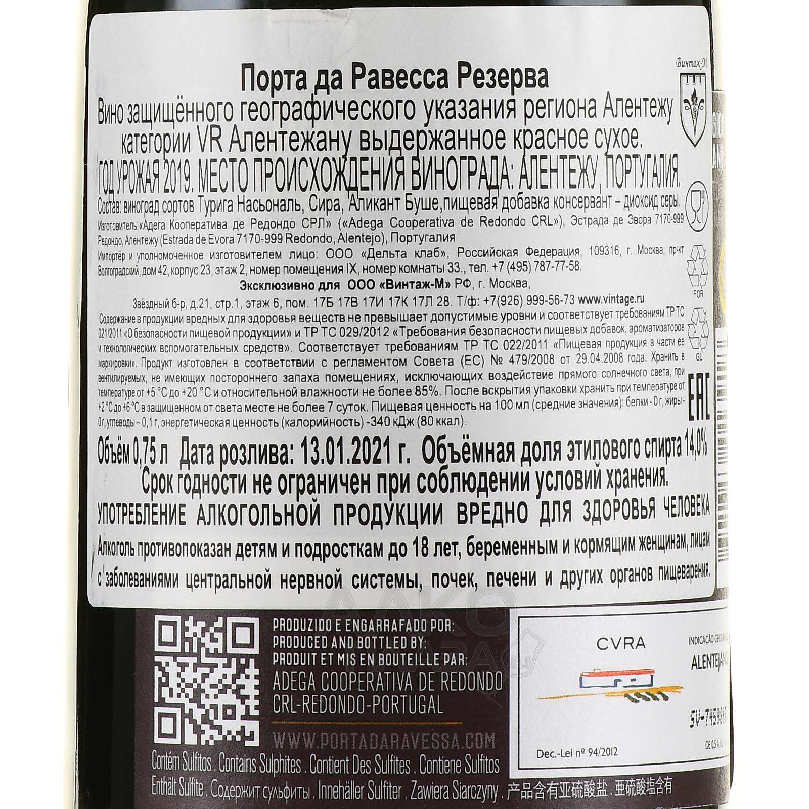 Красное сухое вино Porta da Ravessa Reserva 0,75 л представляет собой эксклюзивный купаж из сортов Турига Насиональ, Аликант Буше и Сира. Сырье поступает с виноградников апелласьона Алентежу, которые разбиты на глинисто-известняковых и сланцевых почвах. Собранный вручную урожай проходит традиционную винификацию. Вино минимум 6 месяцев выдерживается в бочках из французского дуба. Оно получило признание на престижном международном конкурсе.