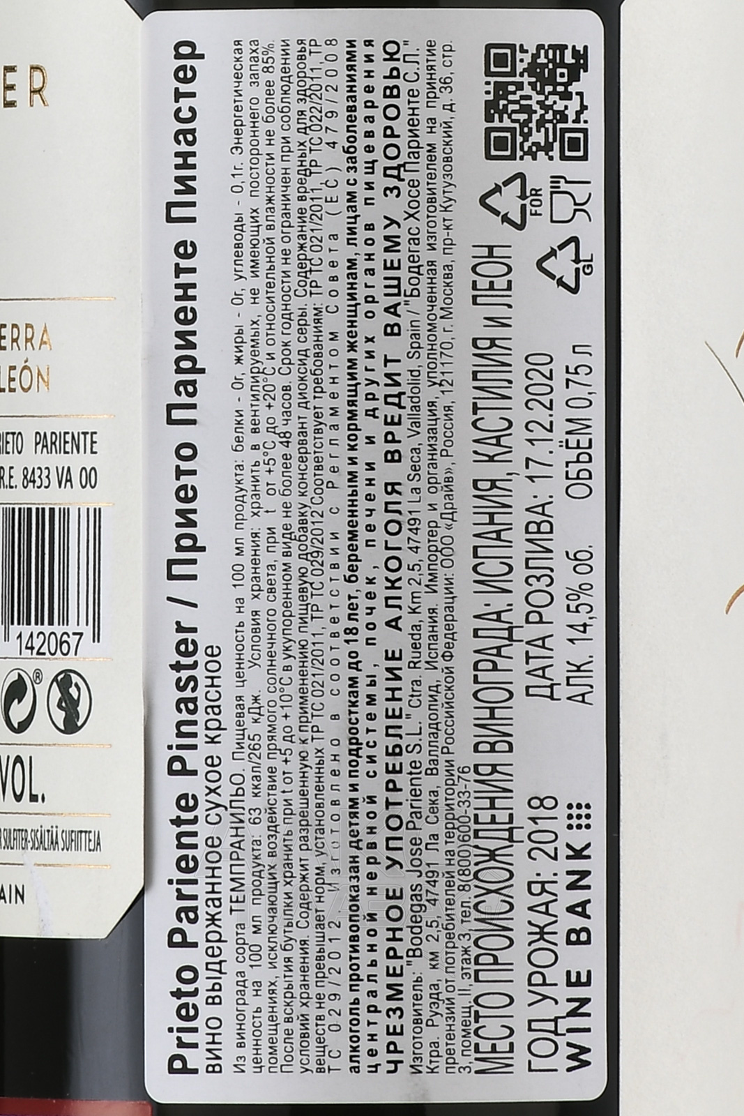 Prieto Pariente Pinaster - вино Прието Париенте Пинастер 0.75 л красное сухое