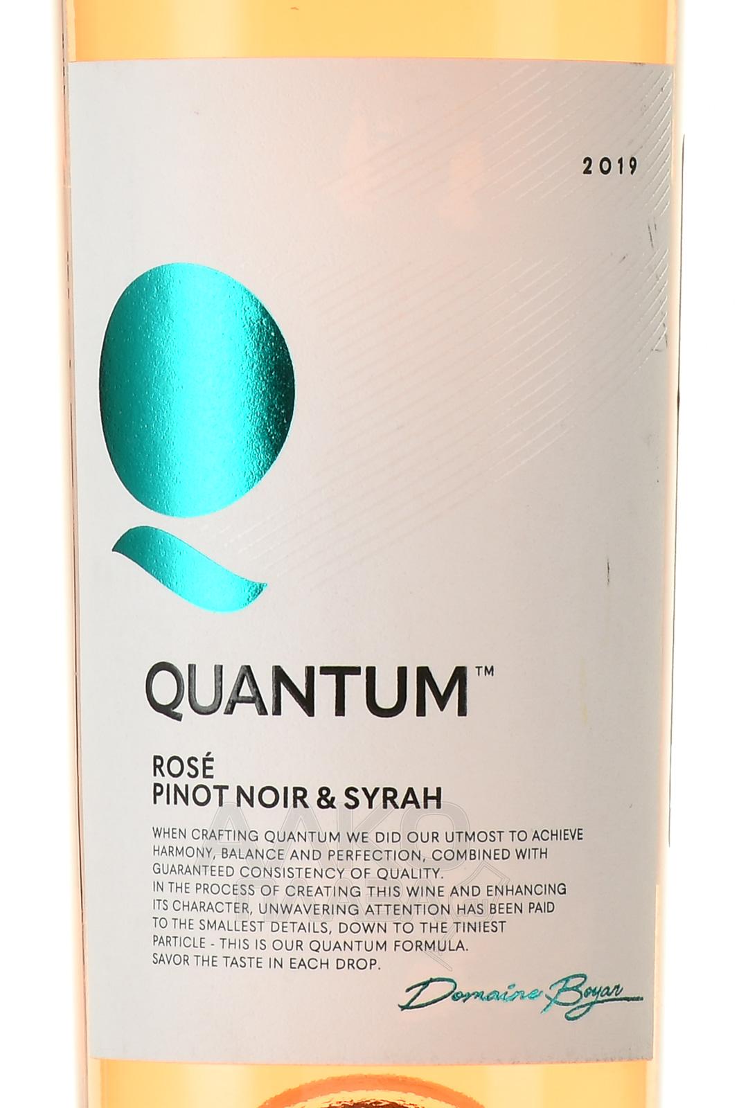 Розовое сухое вино Quantum Pinot Noir & Syrah Rose 2019 г. 0,75 л — молодой напиток болгарского производства, состав которого объединяет красный виноград с плантаций Тракийской равнины. Винификация каждого сорта проводилась по отдельности при контроле температурных показателей. Также вино со спиртуозностью 13% было отфильтровано перед розливом по бутылкам.