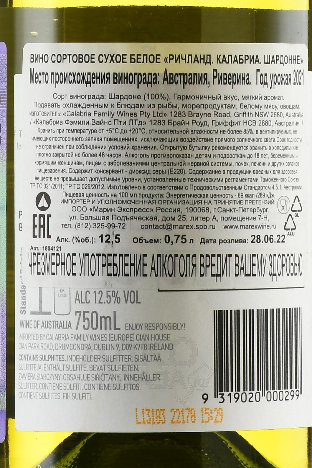 Белое сухое вино Richland Chardonnay 0,75 л - моносортовой образец, производимый в регионе Риверина в Австралии. Урожай собирают в момент оптимальной спелости в ночное время суток для сохранения свежести. Полученные грозди сортируют и винифицируют при контролируемой температуре. Часть готового вина созревает на тонком осадке для придания большей сложности.