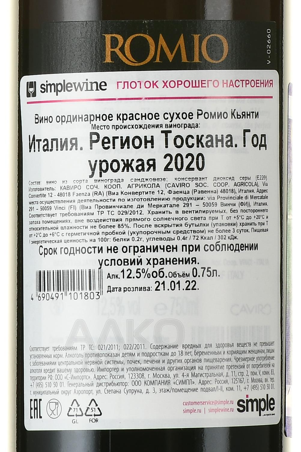 Красное сухое вино Romio Chianti 2020 г. 0,75 л с защищенным наименованием места происхождения имеет крепость 12,5%, а в его составе присутствуют традиционные итальянские виноградные вариации. Сбор сырья осуществился ручным способом на территории области Toscana в один урожайный год. В процессе обработки ягоды мацерировались и сбраживались в нейтральных металлических резервуарах.