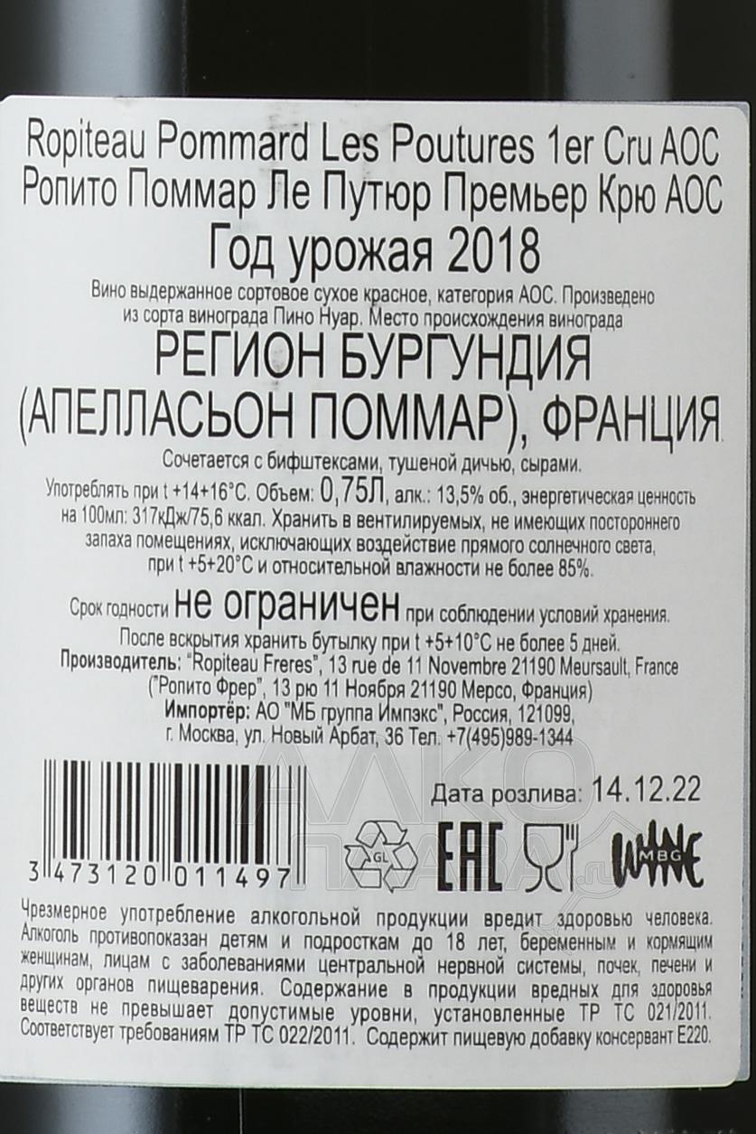 Красное сухое вино Ropiteau Pommard Les Poutures 1er Cru 0,75 л - моносортовой образец для производства которого используются отборные ягоды собираемые на участках ,классифицированных как Премьер Крю. Сбор урожая происходит на этапе оптимальной спелости с отдельного виноградника "Ле Путюр". После сбора грозди сортируют и отжимают после чего винифицируют в деревянных емкостях. Созревание готового вина проходило в бочках из французского дуба не менее 14 месяцев, при чем 25% бочек используются впервые.