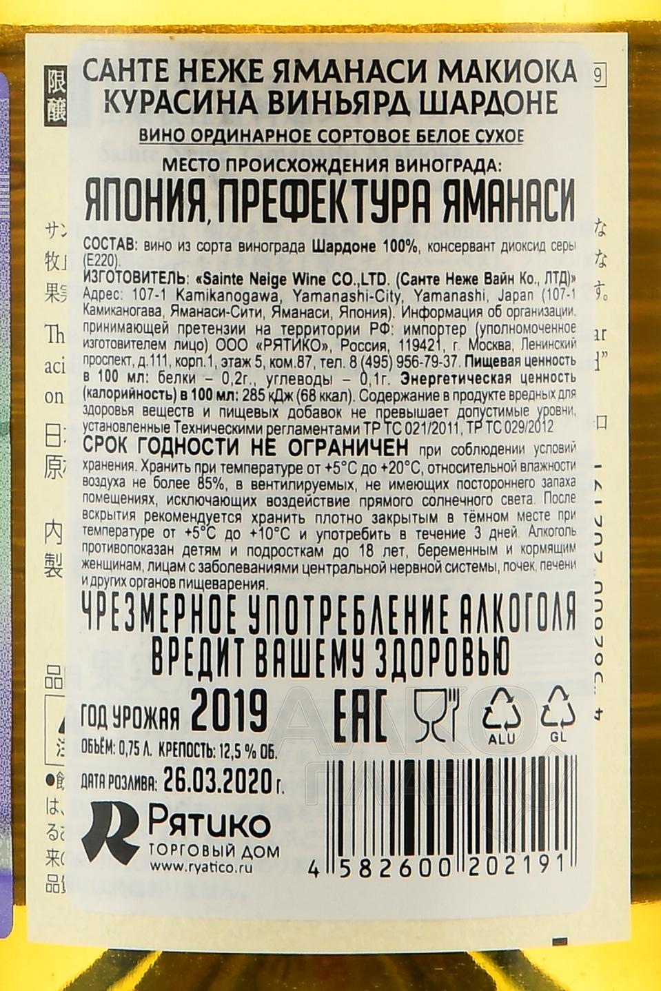 Белое сухое вино Sainte Neige Yamanashi Makioka Kurashina Vineyard Chardonnay 2019 г. 0,75 л воплощает в себе не просто уникальный колорит Японии, но саму душу этой страны, ее красоту и чистоту национальной природы. В роли сырья выступил европейский сорт Шардоне, который культивируется в небольшом объеме на винограднике в окрестностях города Макиока (префектура Яманаси). Он разбит на склоне холма на высоте более 700 м и имеет южную экспозицию. Лозы получают много солнечного света и тепла на протяжении почти всего дня, но ночью температура заметно понижается, и такие колебания благоприятно сказываются на органолептике винограда. Его собирают вручную в сентябре, прессуют, затем сусло 5 часов мацерируют на мезге и отжимают. Винификация протекает сначала в стальных емкостях, затем во французских бочках, в которых затем напиток выдерживается несколько месяцев. Вино выпускается очень небольшим тиражом, является редкостью и представляет интерес для коллекционеров.