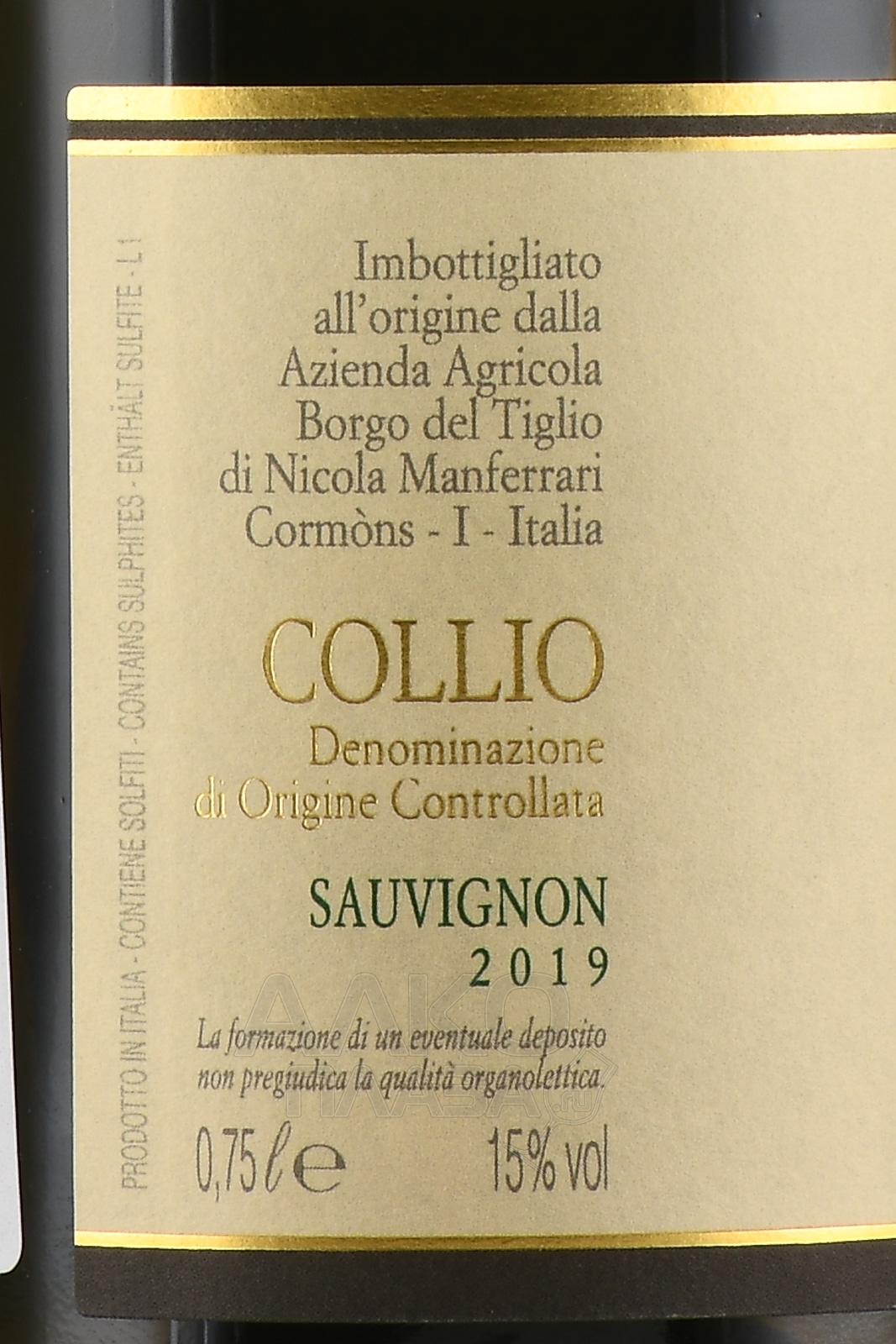 Белое сухое вино Sauvignon Collio DOC 2019 г. — 15-процентный итальянский напиток защищенного географического наименования, произведенный в регионе Фриули-Венеция-Джулия (область Коллио) из одного сорта винограда. Отжатые спелые ягоды ферментировались в цистернах из нержавеющей стали при термоконтроле.