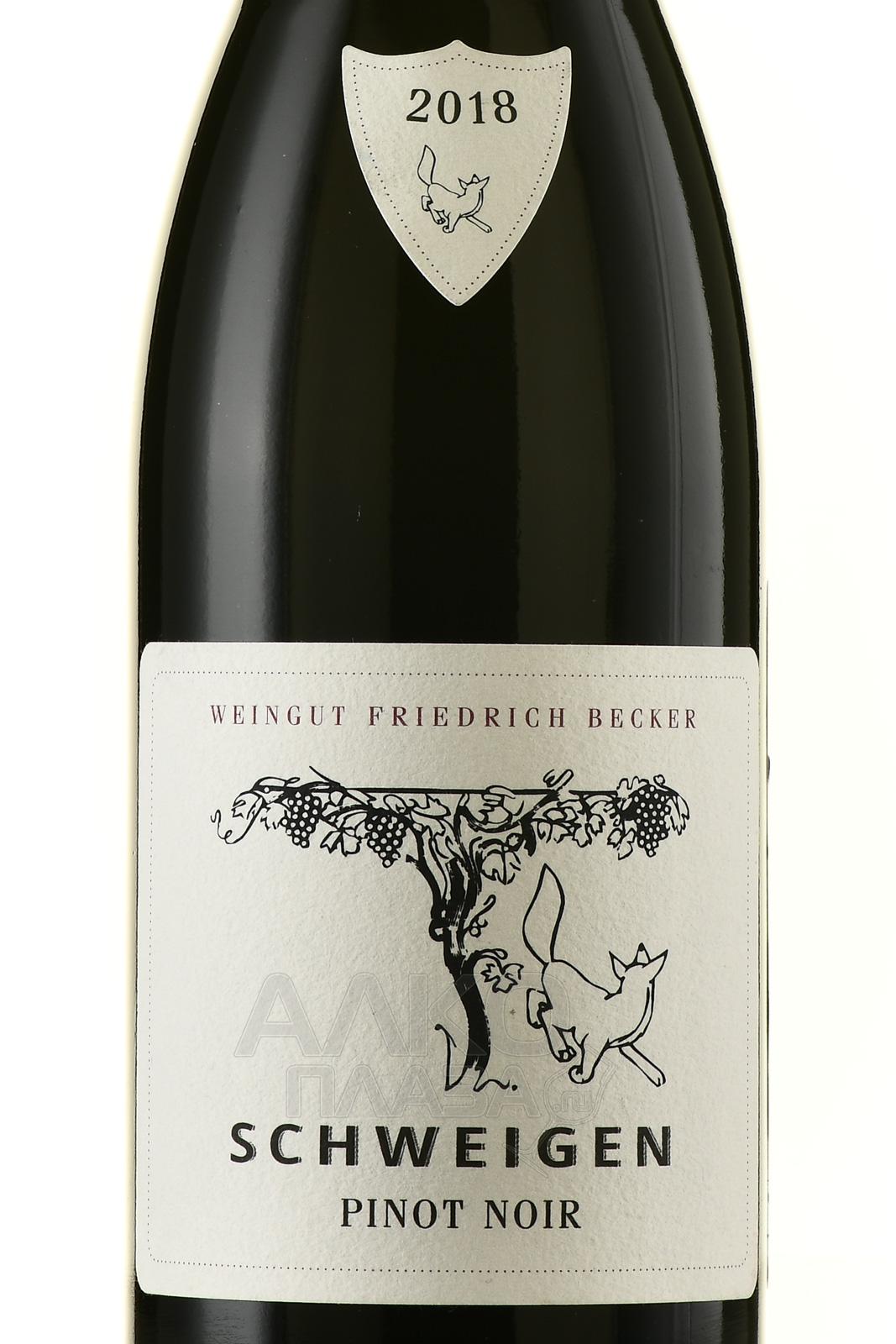 Красное сухое вино Schweigen Pinot Noir 2018 г. 0,75 л от уважаемого предприятия Германии, которое возглавляют Фридрих Беккер и члены его семьи, относится к моносепажному типу. Состав напитка на 100% состоит из ягод Пино Нуар — сорта, распространенного в регионе производства данной версии — Пфальце. Его собрали с лоз возрастом от 25 до 50 лет в течение 2018 года. Технология изготовления подразумевала проведение отжима, мацерации и сбраживания в открытой таре сроком до 21 дня. Выдержка вина, имеющего большой потенциал к хранению (10-15 лет), была долгой — 3 года.