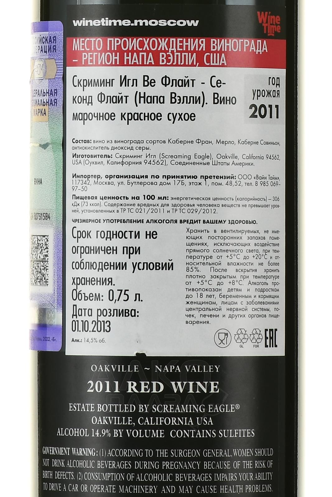 Красное сухое вино Screaming Eagle The Flight 2011 г. 0,75 л изготовлено из трех вариаций европейского винограда, который культивировали на угодьях солнечной Калифорнии, в Долине Напа. На обработку отправилось только собранное вручную сырье, отсортированное для исключения возможности попадания на винодельню поврежденных ягод. Винификация проводилась стандартным методом — в нейтральной металлической таре, где поддерживался необходимый режим температур. Также вино выдерживалось во французских барриках длительное время. Его выпустили лимитированное линейкой. Согласно экспертным оценкам, напиток обладает выдающимся потенциалом хранения — до пятидесяти лет. Этим объясняется его высокая стоимость.