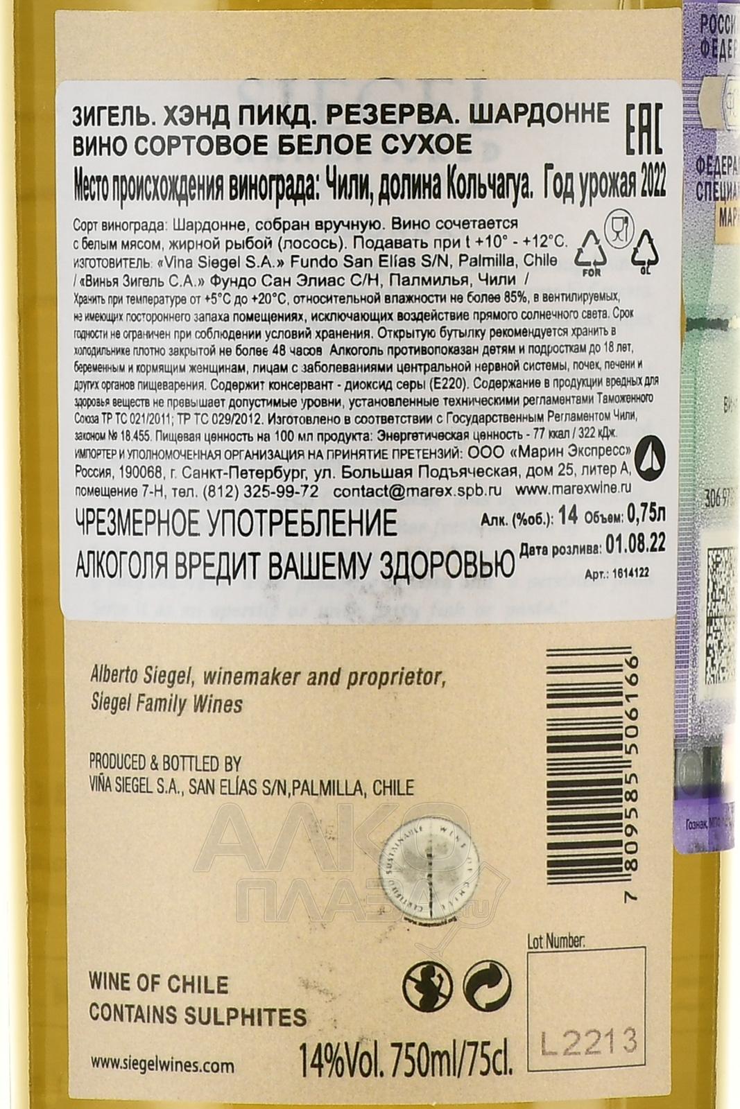 Белое сухое вино Siegel Handpicked Reserva Chardonnay 2022 г. 0.75 л сделано из собранного вручную винограда, который был выращен в чилийской долине Кольчагуа. Используется только самое спелое и тщательно отсортированное сырье. Его мягко прессуют, затем сусло отправляют бродить в стальных резервуарах при 15 градусах. Вино частично (25%) выдерживают в небольших по объему бочонках из американского дуба. Процесс занимает около 3 месяцев. Напиток стабилизируют, сильно охлаждая, пропускают через мембранные фильтры и бутилируют.
