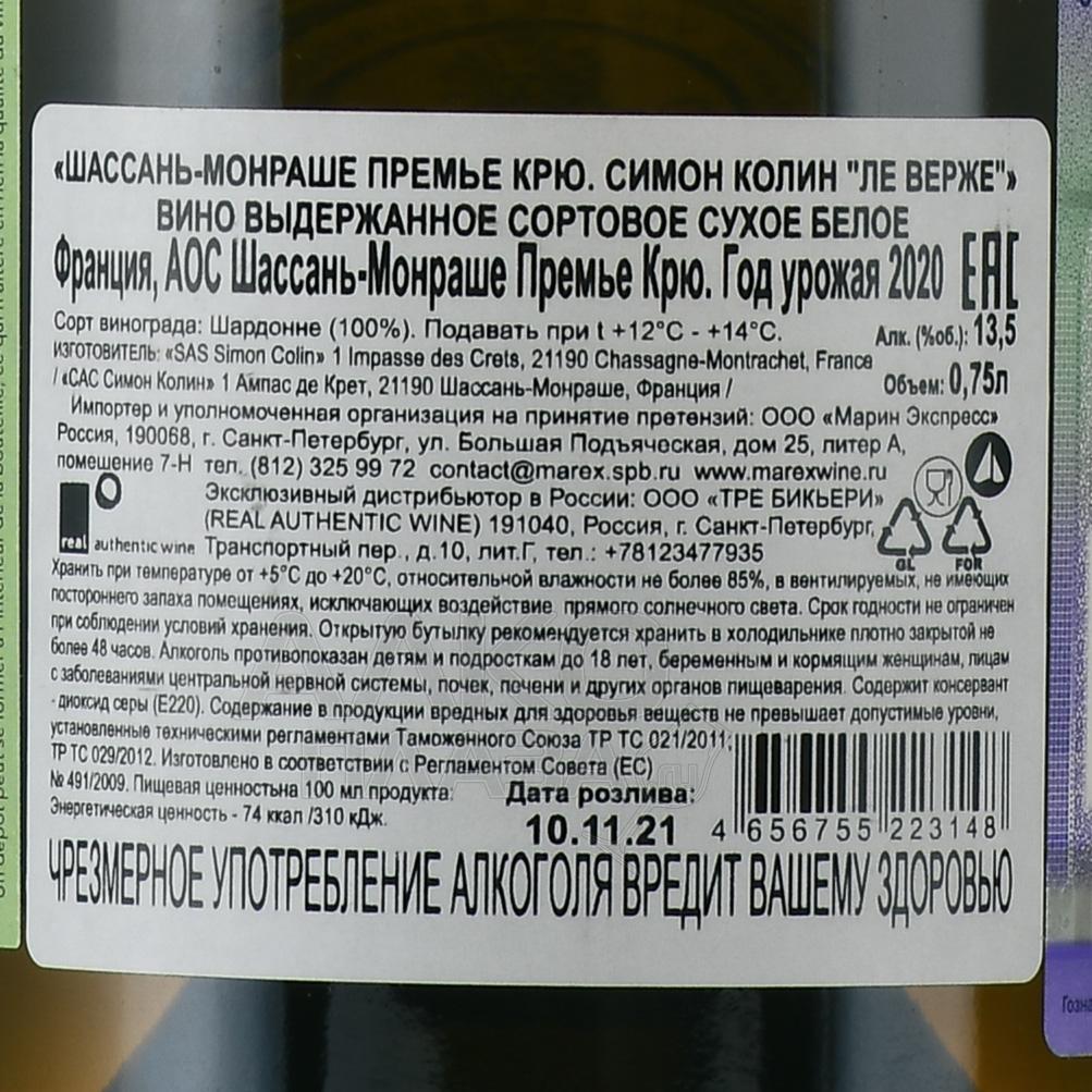 Белое сухое вино Simon Colin Les Vergers Chassagne-Montrachet Premier Cru 0,75 л является образцом из коммуны Шассань-Монраше, которая считается одной из лучших винодельческих зон Бургундии. Ягоды собираются ручным способом с отдельного виноградника Ле Верже, который классифицирован как Премьер Крю. После мягкого отжима происходило алкогольное брожение при низкой температуре для сохранения ароматичности. Выдержка готового вина осуществлялась в бочках из французского дуба, 20% из которых новые, на протяжении минимум 15 месяцев.
