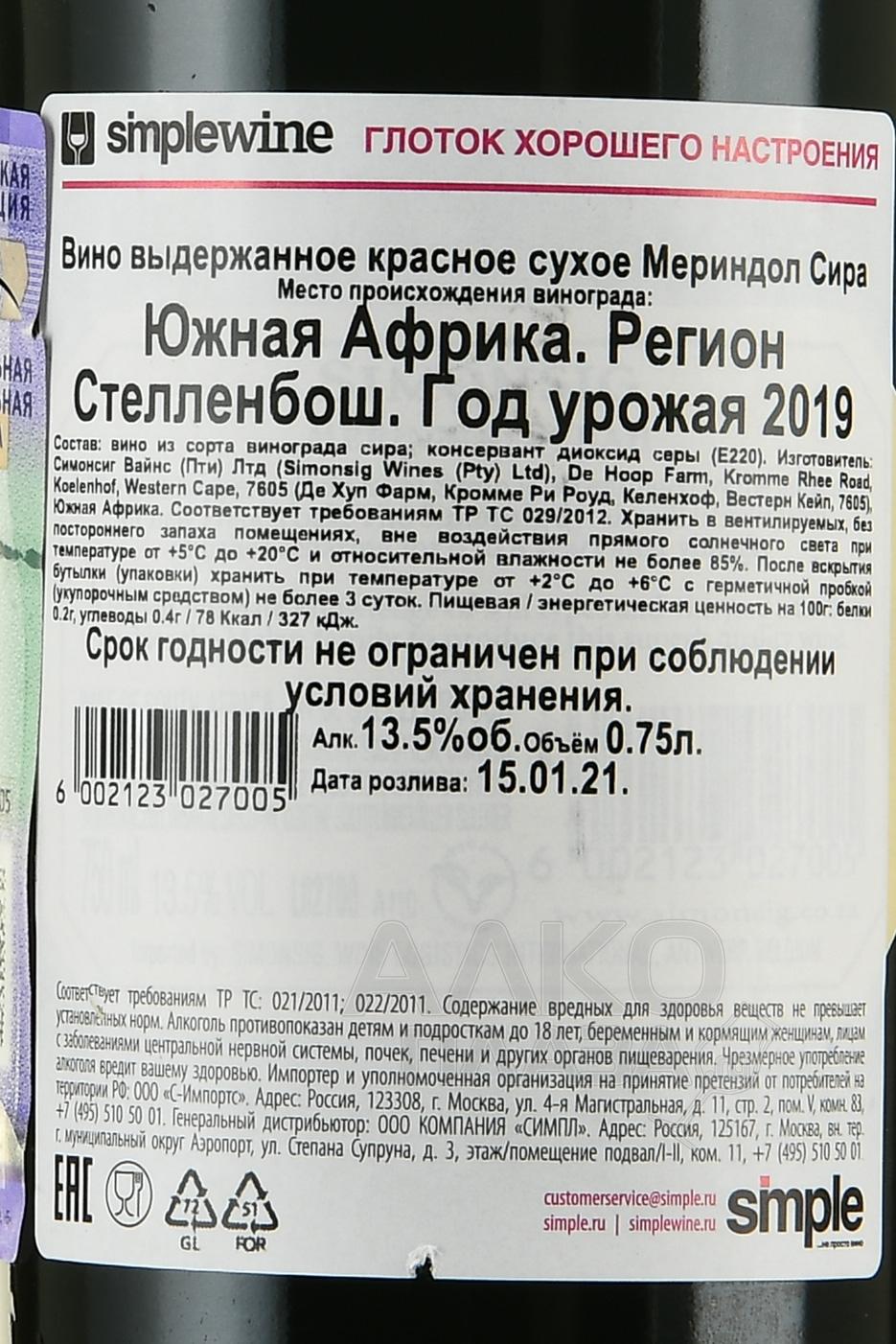Красное сухое вино Simonsig Merindol Syrah 2019 г. 0,75 л производится в ЮАР из сорта Сира, который был завезен из Франции и высажен в 1996 году на винограднике Мериндол, принадлежащем компании Симонсиг. Здесь культивируется клон европейской разновидности SH99. Он дает хорошие урожаи в условиях засушливого климата, будучи высаженным на глинистых почвах, которые удерживают влагу. Урожай собирают ручным способом и сразу сортируют, на винодельне проводится частичное гребнеотделение. Сусло выдерживают 2 суток при низкой температуре, затем ферментируют на мезге при 30 градусах 20 дней, после чего следуют этапы пост-мацерация и яблочно-молочного брожения в французских бочках. Используются новые емкости. В них же вино проходит выдержку 1,5 года. Оно получило больше десятка медалей на престижных конкурах мирового уровня. Потенциал его хранения составляет минимум 10-12 лет.