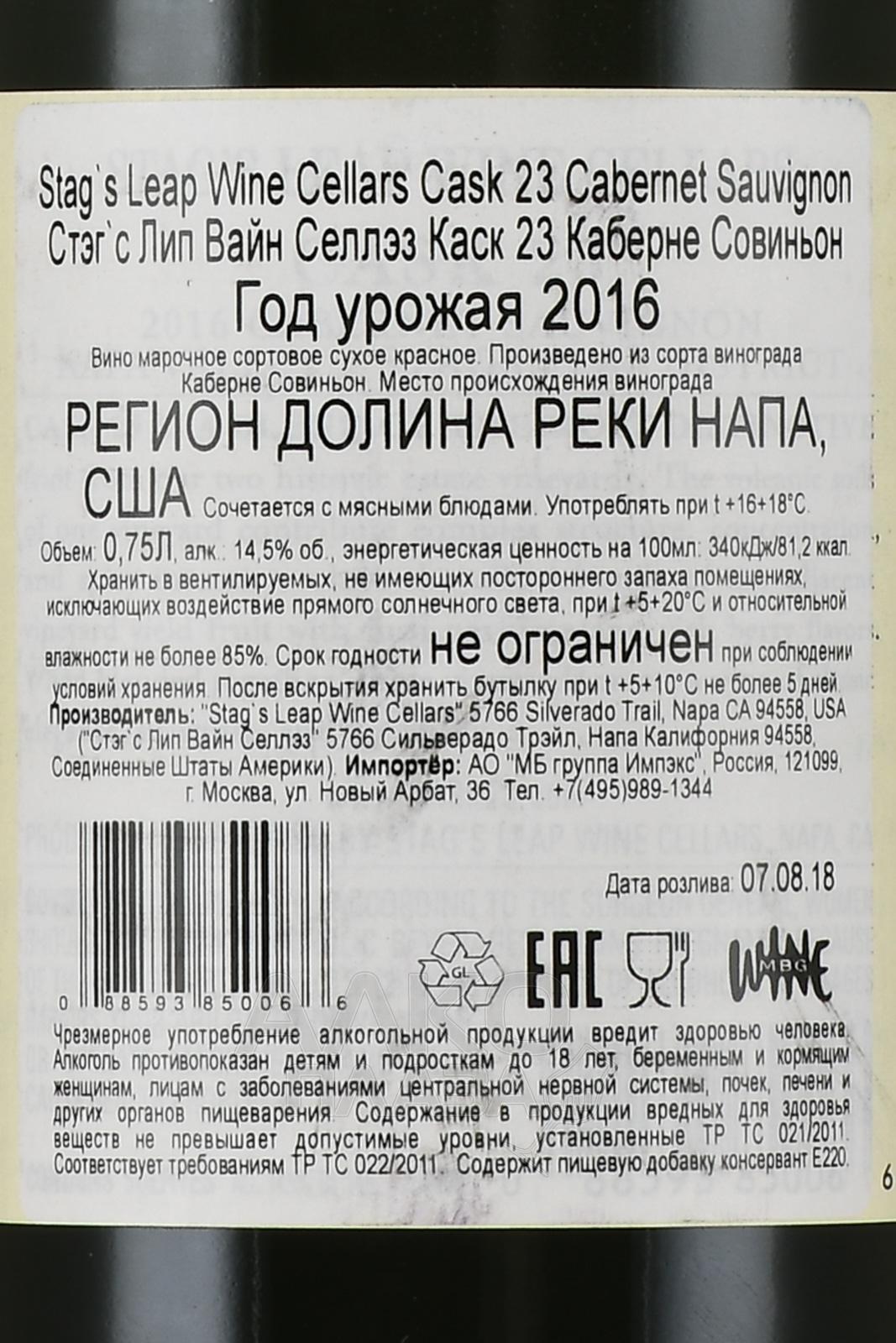 Красное сухое вино Stag`s Leap Wine Cellars Cask 23 Cabernet Sauvignon 2016 г изготовлено из ценного урожая ягод Каберне Совиньон, собранного вручную в один из ценных годов (2016). Напиток родом из США, Долины Напа (штат Калифорния), произведено посредством винификации с термоконтролем и вызревания сроком 21,5 месяца в небольших бочонках из французского дуба (90% из них ранее не использовались). Винтаж крепостью 14,5 градуса с выдающимся потенциалом к выдержке (до 20 лет) рекомендуется употребить в период с 2021 по 2036 г.