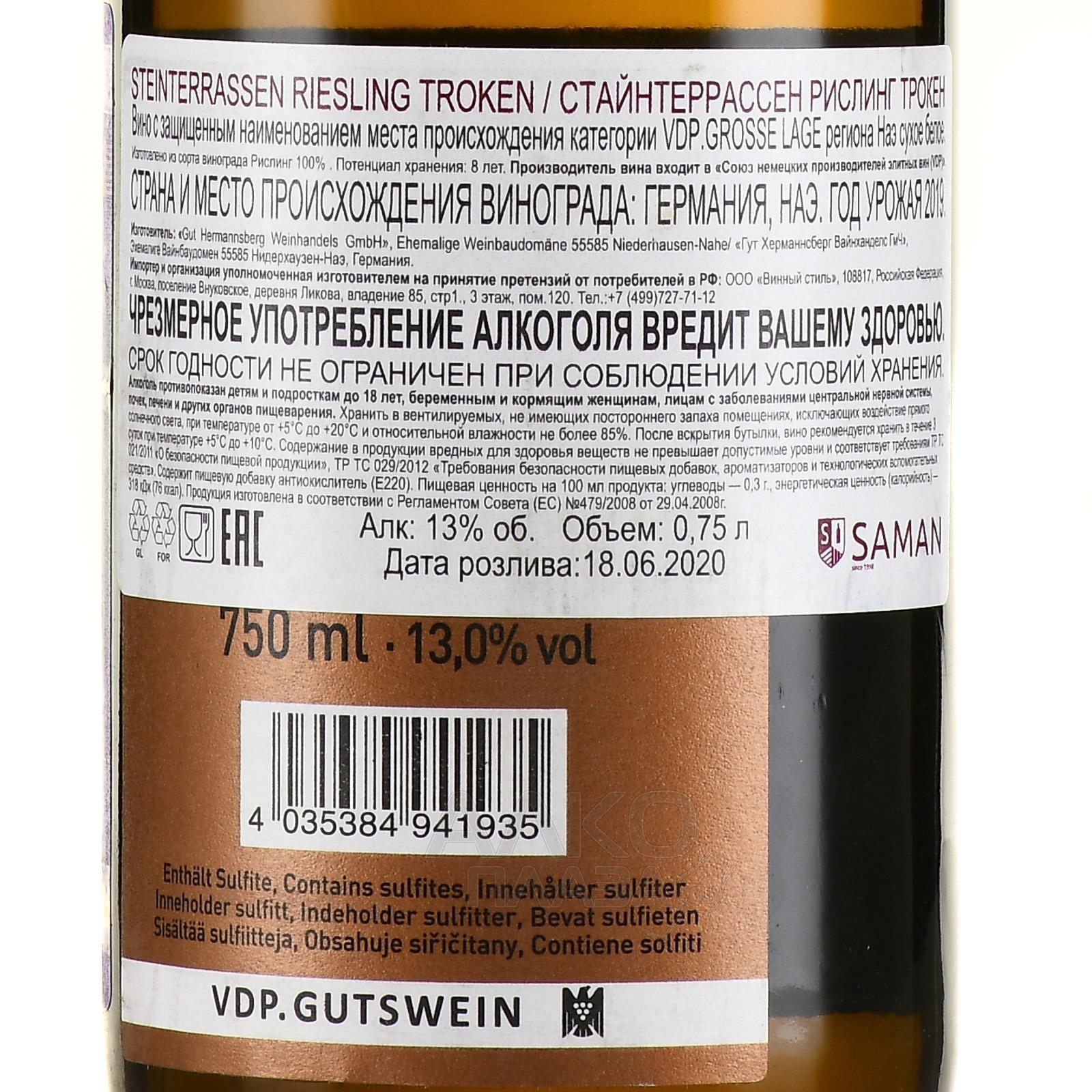 Белое сухое вино Steinterrassen Riesling Trocken 0,75 л - высококлассный моносепажный образец из немецкого региона Наэ. Он создан из винтажных урожаев винограда, собранного на трех крупных участках. Плантации расположены на крутых склонах. Терруар, в котором созревают ягоды, благоприятное воздействие на вкусоаромат готового напитка, привнося в него дымные и пряные нюансы.