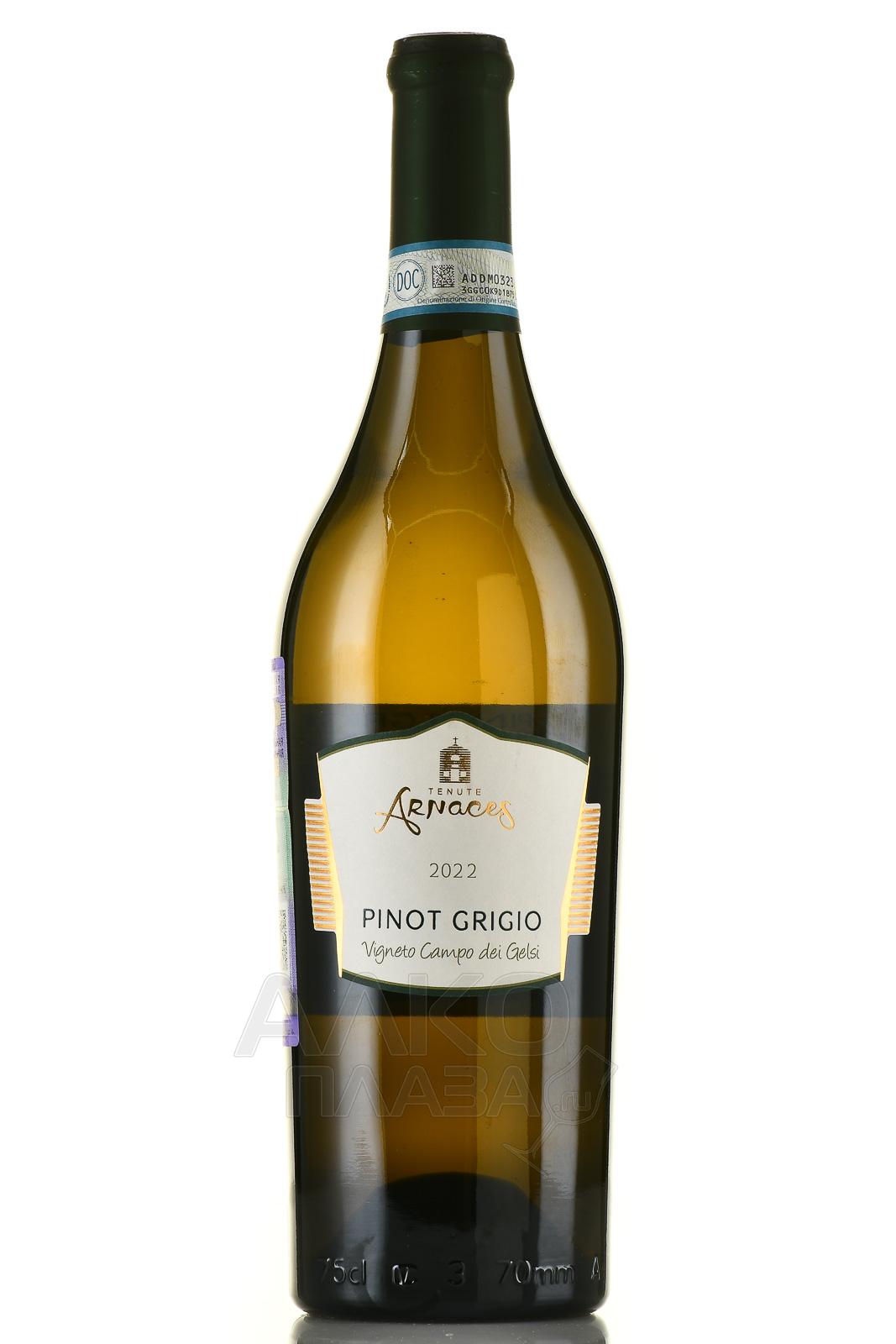 Белое сухое вино Tenute Arnaces Pinot Grigio Campo dei Gelsi DOC 0,75 л производится под наименованием, защищенным по географическому признаку. Урожаи для винификации собирают строго в рамках одной зоны – в регионе Фриули-Венеция-Джулия. Виноград происходит с органических участков в местечке Мортельяно провинции Удине. Плотность посадок и урожайность на плантациях строго ограничены – не более 4000 лоз на один гектар и 3,5 кг ягод с каждого растения. Плоды собирают машинным способом в прохладное ночное время. На винодельне сырье мягко прессуют, а сусло сбраживают при контролируемой температуре в резервуарах из нержавеющей стали.