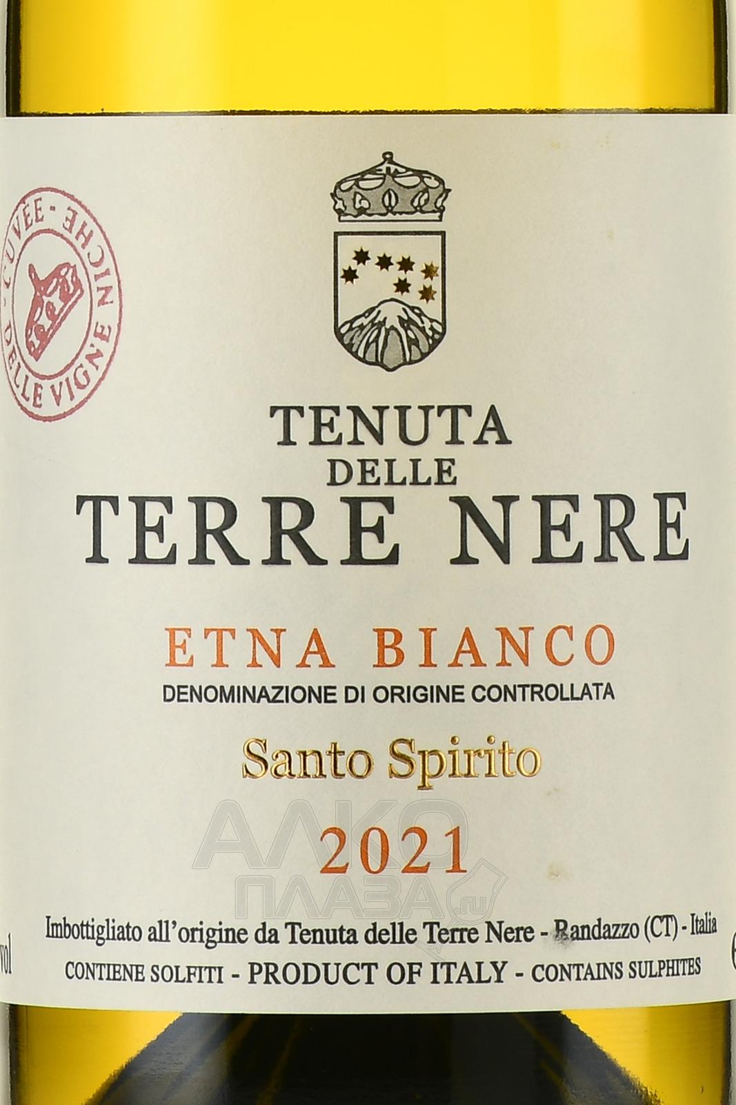 Белое сухое вино Terre Nere Etna Bianco Santo Spirito DOC 0,75 л – купажированная вариация, выпускаемая лимитированными тиражами. Ежегодно в продажу поступает от 4000 до 6000 бутылок этого напитка, созданного из двух популярных сицилийских сортов винограда со светлой кожицей. Урожаи для производства спиртного выращивают на северной стороне вулкана Этна на высоте 700-800 метров над уровнем моря, на вулканических почвах района Санто Спирито в муниципалитете Кастильоне-ди-Сицилия. Предназначенное для ферментации сырье мягко прессуют, а отжатый сок сбраживают при низкой температуре в бочках из французского дуба. Далее следуют этапы малолактического брожения и выдержки. В контакте с древесиной вино созревает на протяжении 9 месяцев.