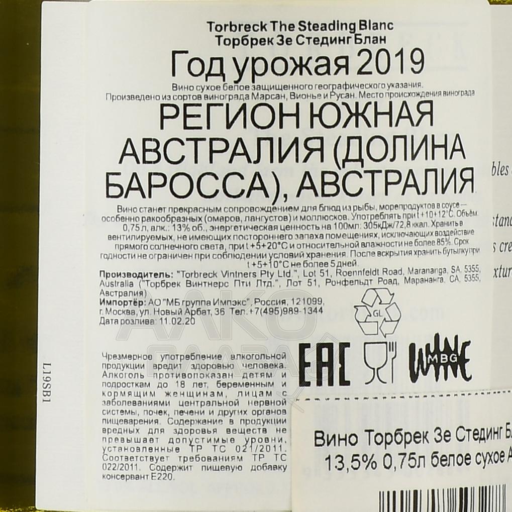 Белое сухое вино Torbreck The Steading Blanc 2019 г. 0,75 л по стилю напоминает образцы из Долины Роны. Оно такое же яркое, сочное, душистое, с минеральными акцентами. По составу это купаж трех сортов, выращенных в австралийской Долине Баросса (юг континента). Сырье было получено на винограднике Descendant в местечке Марананга, который посадили в середине 90-х гг. прошлого века. Урожай 2019 года собирали с конца февраля до середины марта. Ягоды мягко прессовали, сусло медленно ферментировали в стали. Выдержка вина на осадке протекала в барриках из французского дуба и заняла 10 месяцев.