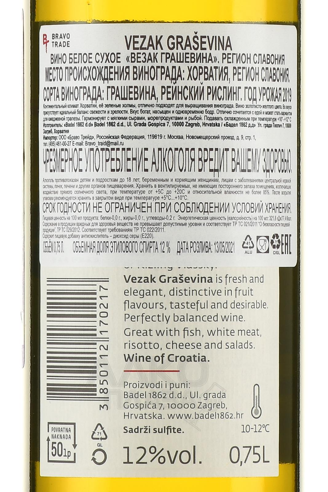 Вино белое сухое Везак Грашевина 2019 г. 0,75 л создано из урожаев винограда одного сбора. Ягоды созрели в терруаре хорватского региона Славония. Винификация проходила в стальных резервуарах, что позволило сохранить яркий фруктовый стиль напитка. Вариация предлагается в стандартной бутылке из зеленого стекла.