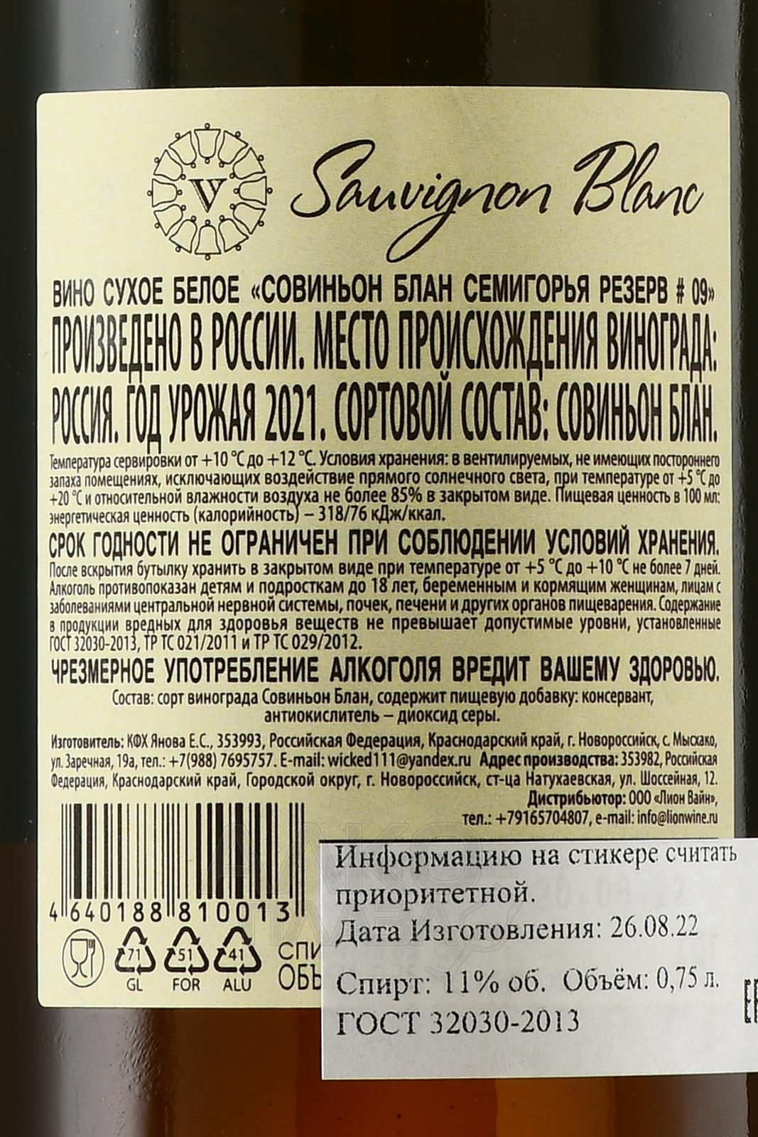 Белое сухое вино Вилла Виктория Совиньон Блан Резерв 2009 год 0,75 л - молодая, свежая, яркая вариация от российского бренда, созданная из одноименного винограда одного года сбора, пятилетние лозы которого культивируются на виноградниках Краснодарского края. Грозди собираются вручную, сортируются и отделяются от гребней, после чего ягоды отжимают, а полученное сусло сбраживается в емкостях из нержавеющей стали при пониженной температуре. Перед бутилированием проводится фильтрация и осветление вина.