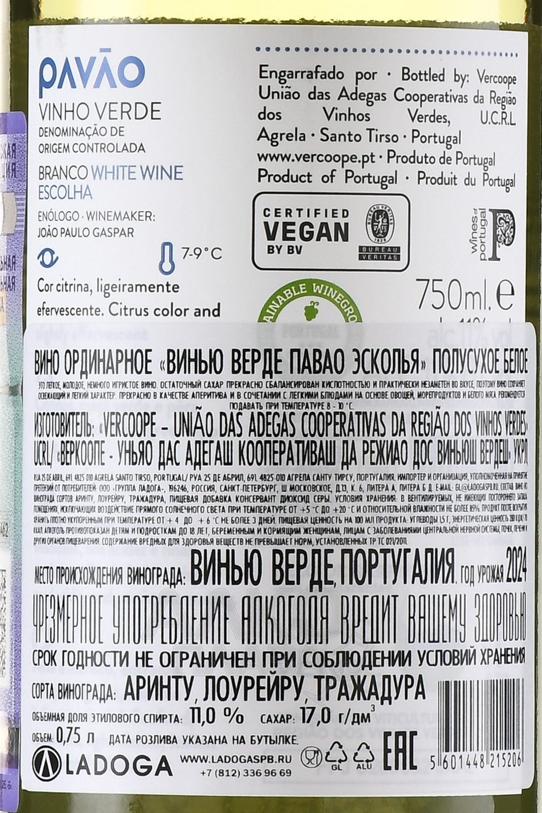 Белое полусухое вино Vinho Verde Pavao Escolha 2023 г. 0,75 л – купаж из традиционных для региона происхождения напитка сортов винограда. В недооцененном, но имеющем внушительный потенциал, терруаре Винью Верде ягоды созревают на известняково-песчаных почвах в мягком морском климате. Прохладные ночи продлевают период созревания плодов, благодаря чему урожай приобретает выразительную ароматику при сохранении оптимальной кислотности. Винификация проходила распространенным европейским способом – при низкой температуре в стальных чанах. Брожению подвергли чистый отстоянный сок, отжатый из охлажденных ягод. После окончания ферментации выдержка не проводилась.